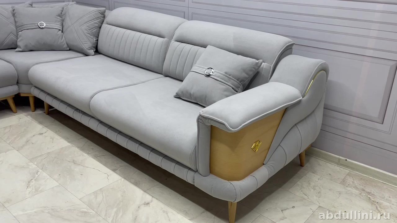 Основной цвет обивки — светло-серый, матовая текстура придает дивану сдержанный и благородный вид. Боковины украшены вставками из светлого дерева, что добавляет теплоты и контраста.