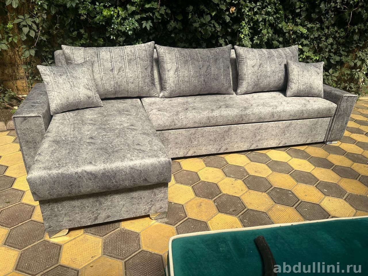 - Комплектация: основной диван, оттоманка, три большие подушки для спинки, две декоративные подушки.