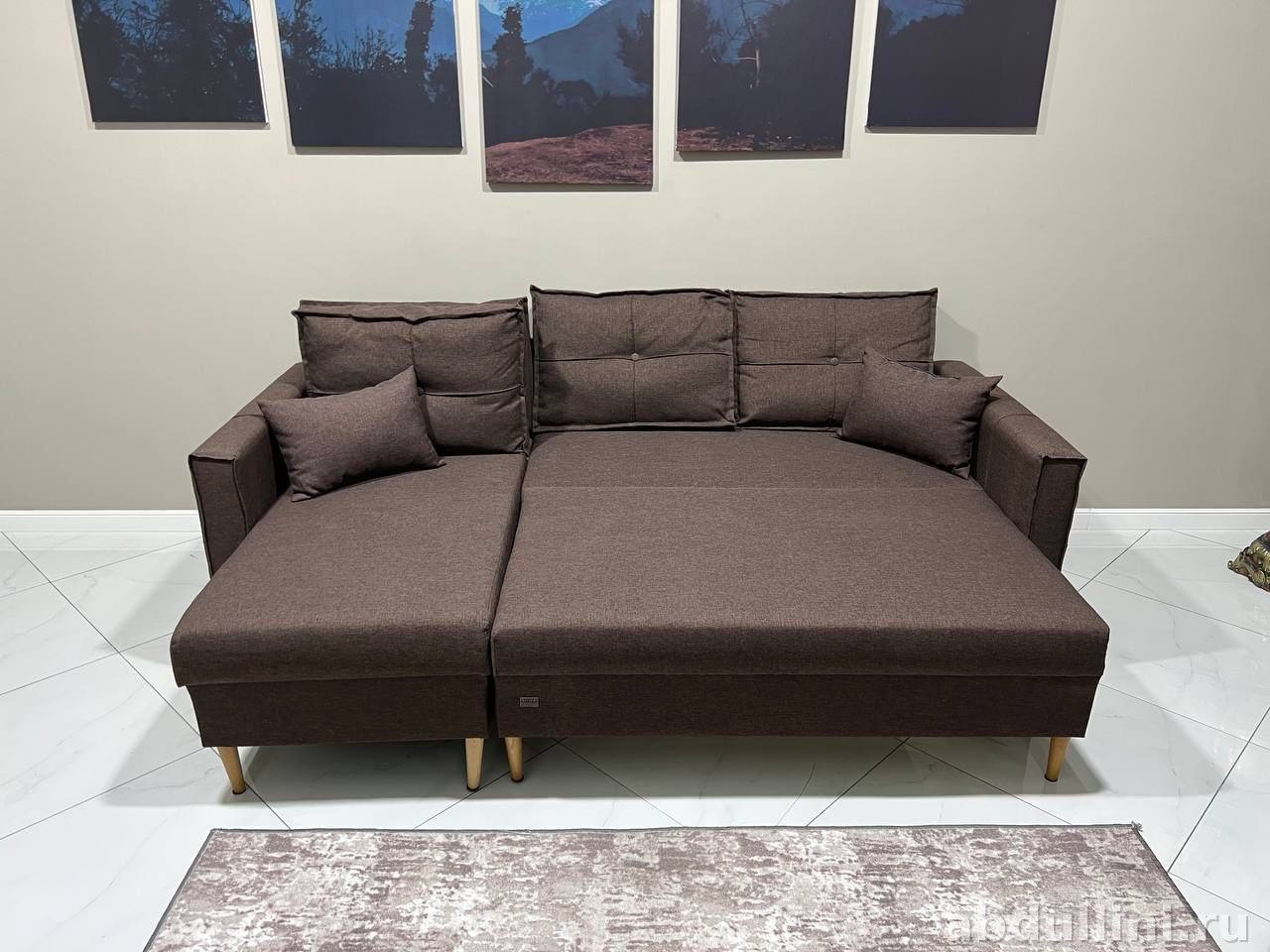 Диван состоит из основной секции и оттоманки, которую можно расположить как справа, так и слева. В комплекте идут три большие подушки для спинки с декоративной прошивкой в виде квадратов и две маленькие декоративные подушки.