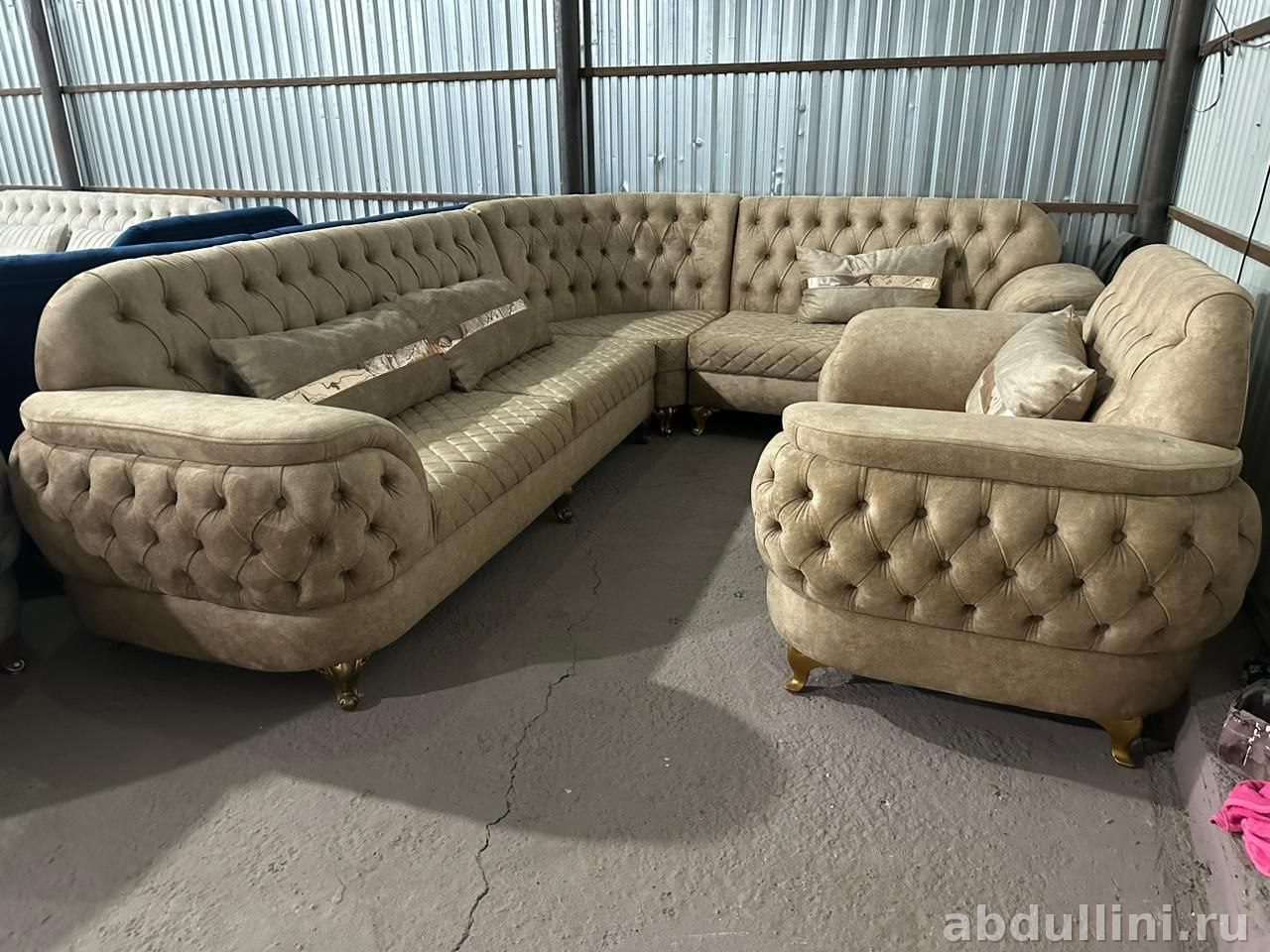 Комплект из углового дивана и кресла в стиле неоклассика с элементами гламура. Основной цвет — светлый беж с оттенком слоновой кости. Обивка выполнена из мягкого велюра с декоративной ромбовидной прострочкой и каретной стяжкой на подлокотниках.