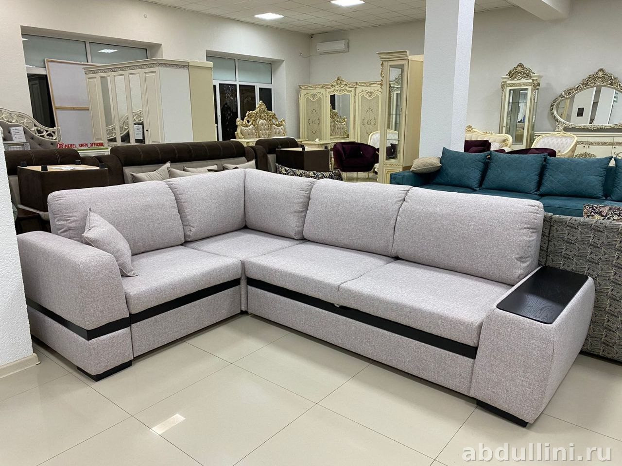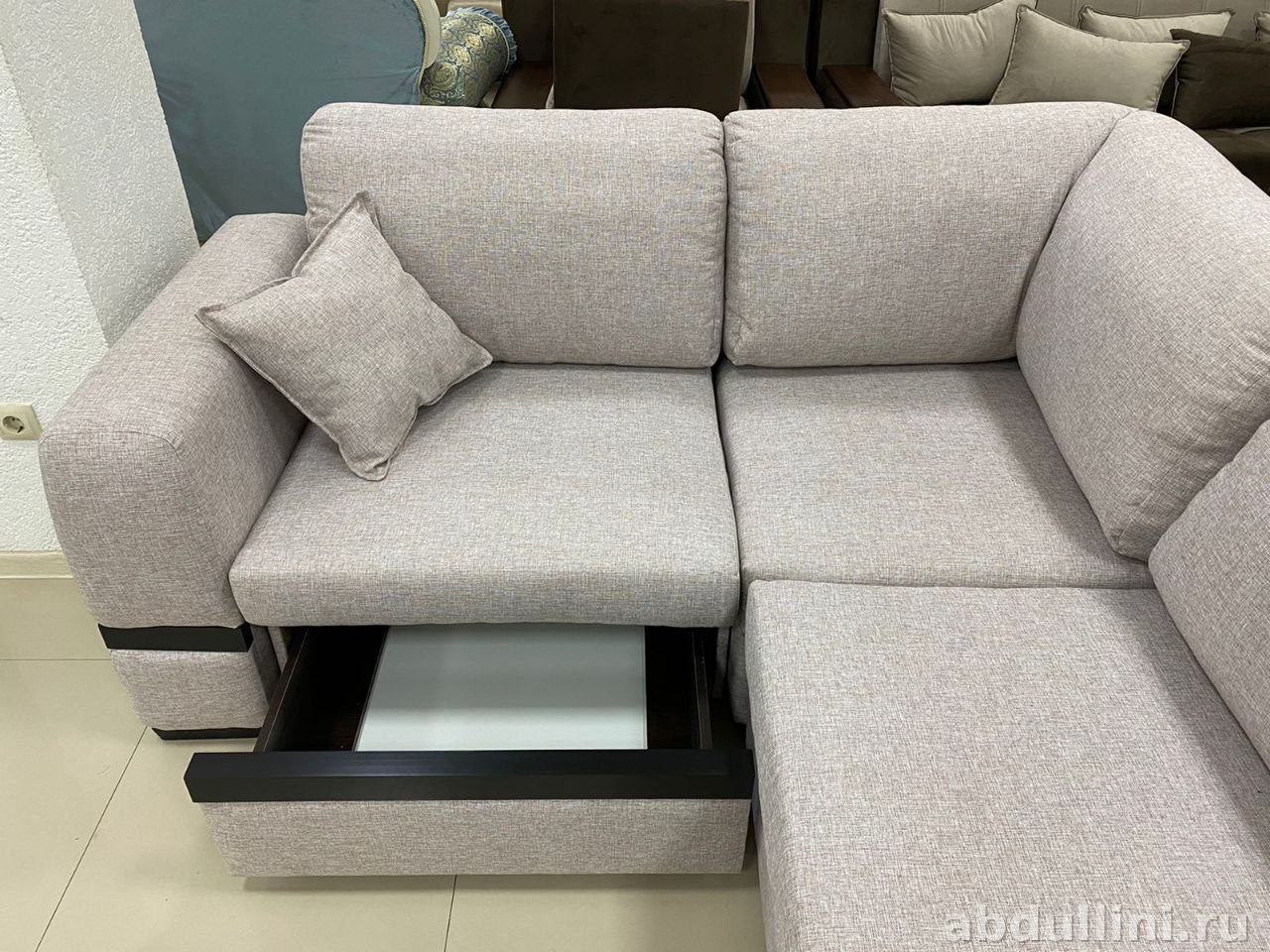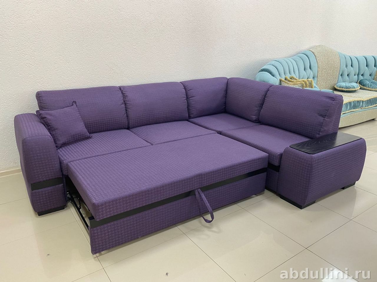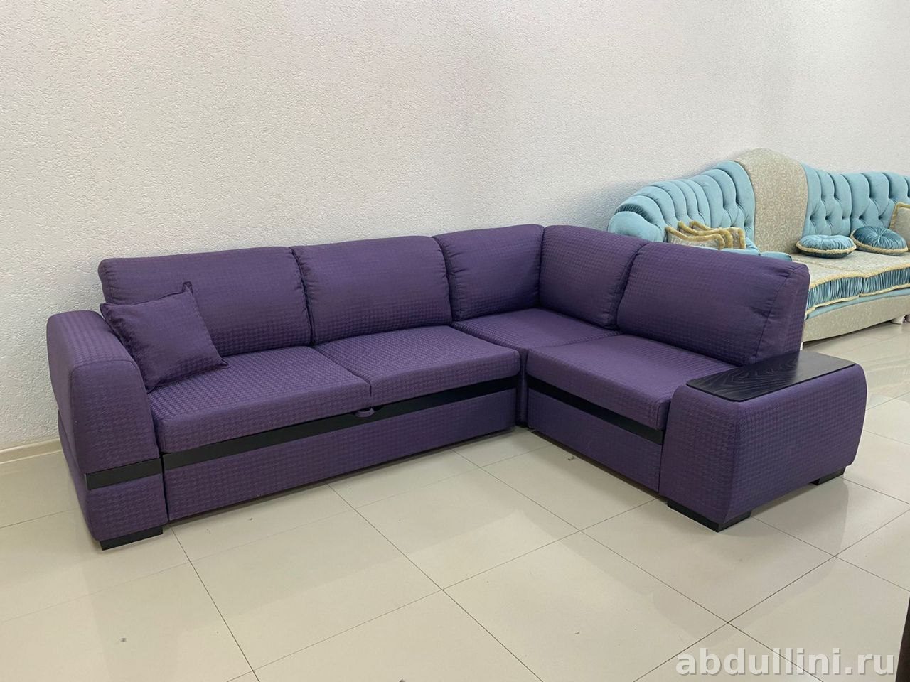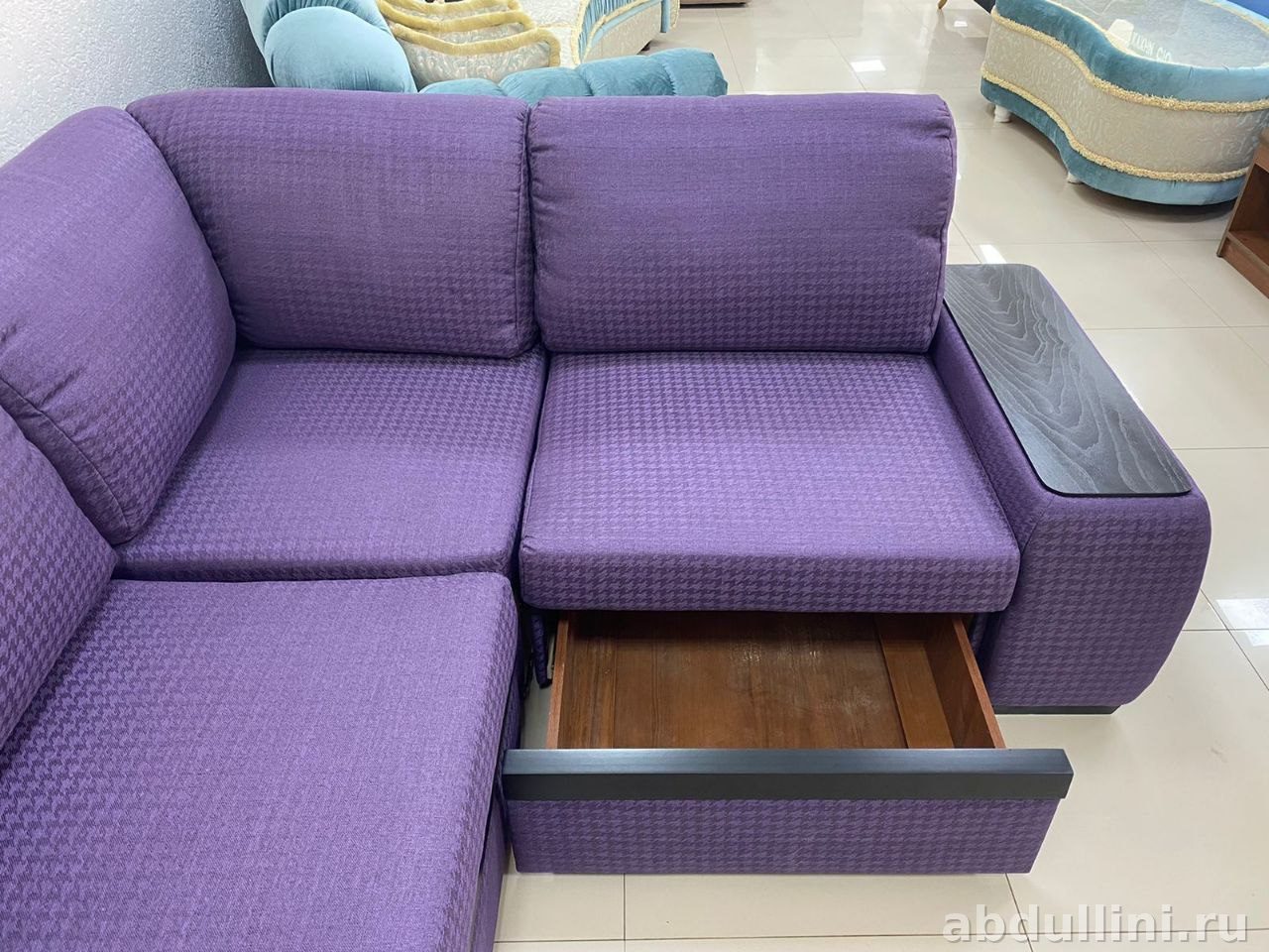 - Комплектация: угловой диван из двух секций, декоративная подушка, приставная тумба с деревянной столешницей.
