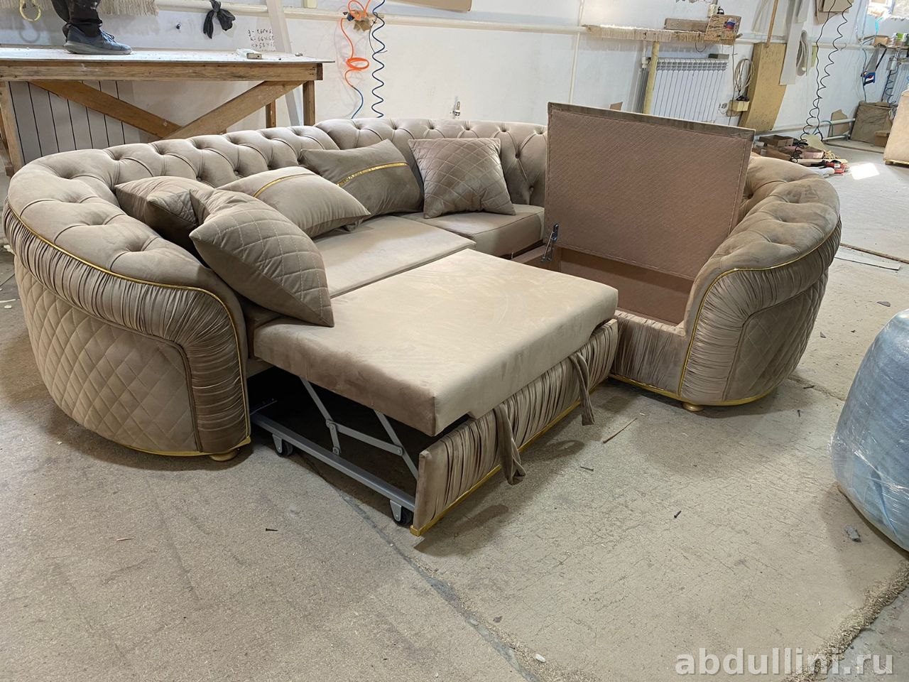 удобный и стильный диван для гостиной или гостевой комнаты. Состоит из двух секций, соединенных в угловой конструкции. Основная секция — классический диван с капитоне (объемной стежкой) по бокам. Вторая секция — выдвижная, легко трансформируется в спальное место.