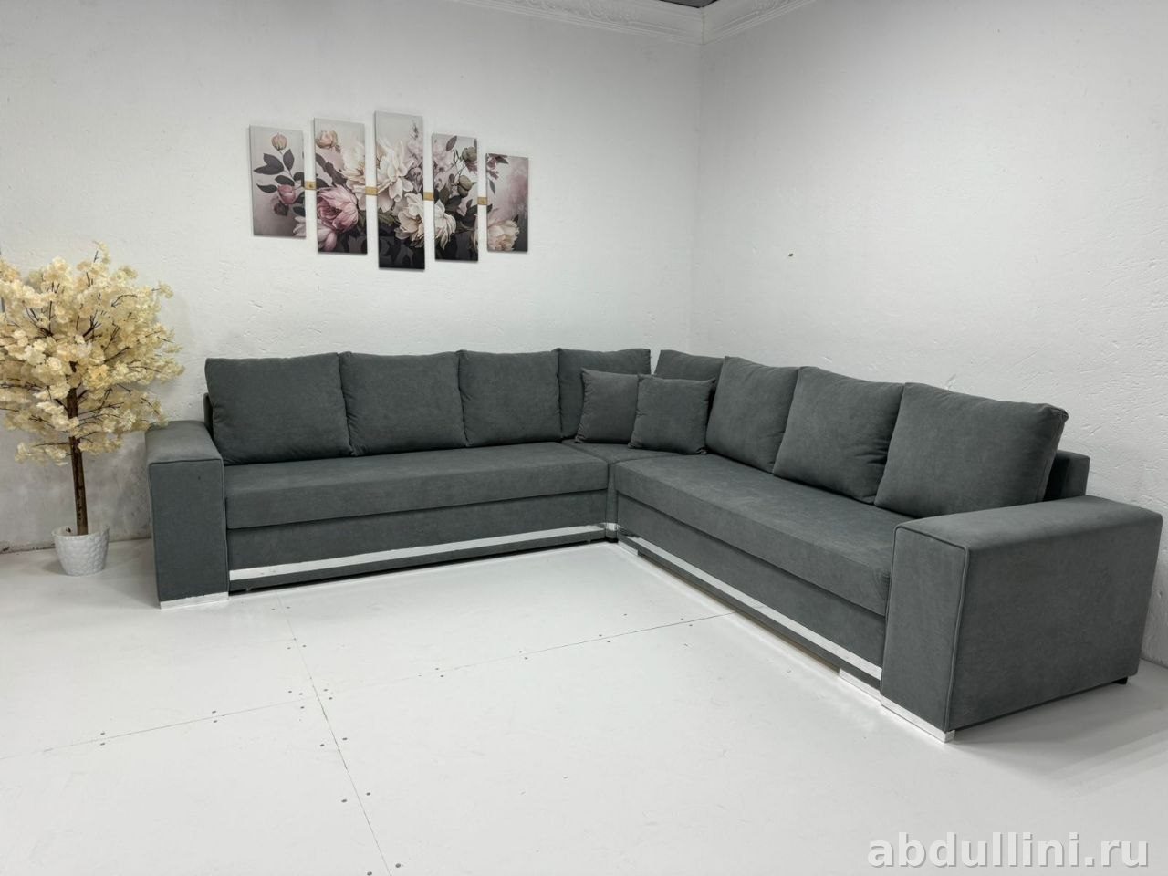 Серый угловой диван с механизмом трансформации в спальное место. Состоит из двух секций, включает 4-5 подушек спинки и две декоративные подушки. Обивка — матовый мебельный велюр, каркас — дерево и металл.
