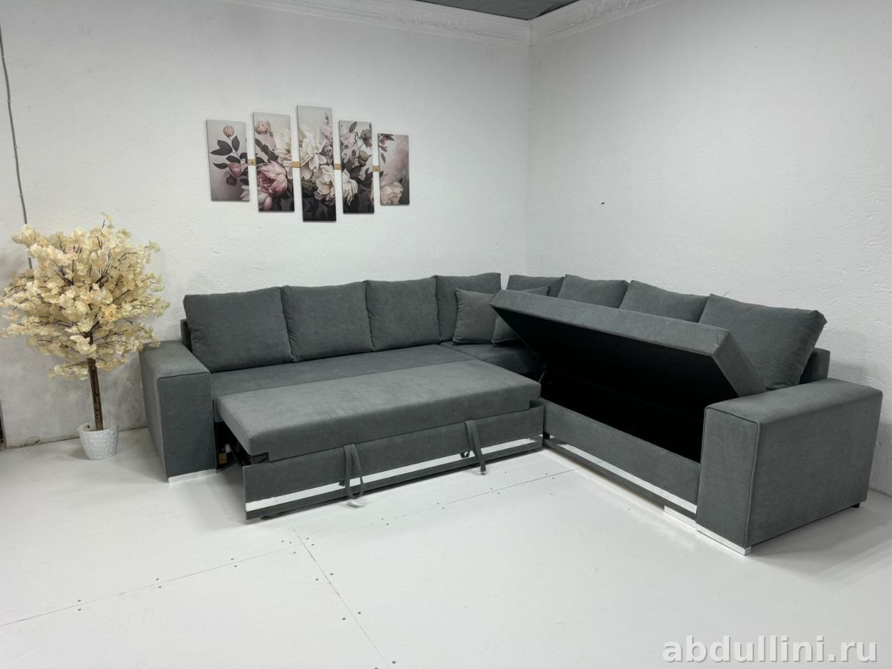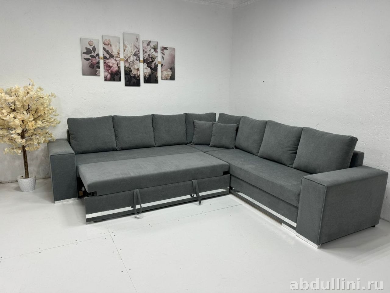 Подойдет для просторной гостиной в современном стиле. Механизм трансформации даёт быстро разложить диван в полноценное спальное место.
