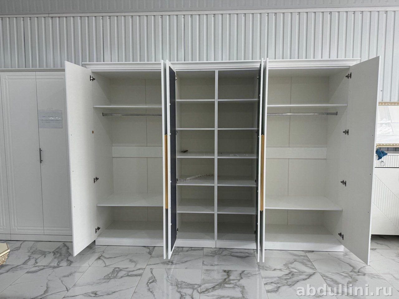 - Комплектация: Шкаф состоит из шести распашных дверей. Внутри расположены полки для сложенной одежды и штанги для развешивания. Центральная часть шкафа оборудована зеркальными вставками на дверцах.