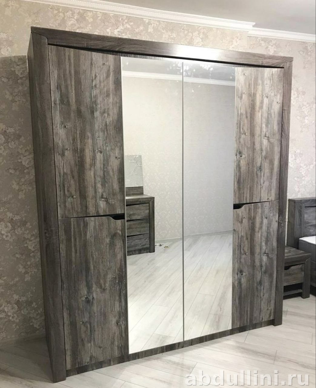 - Шкаф: две зеркальные створки в центре, боковые секции с деревянными дверцами, внутри — полки и штанга.