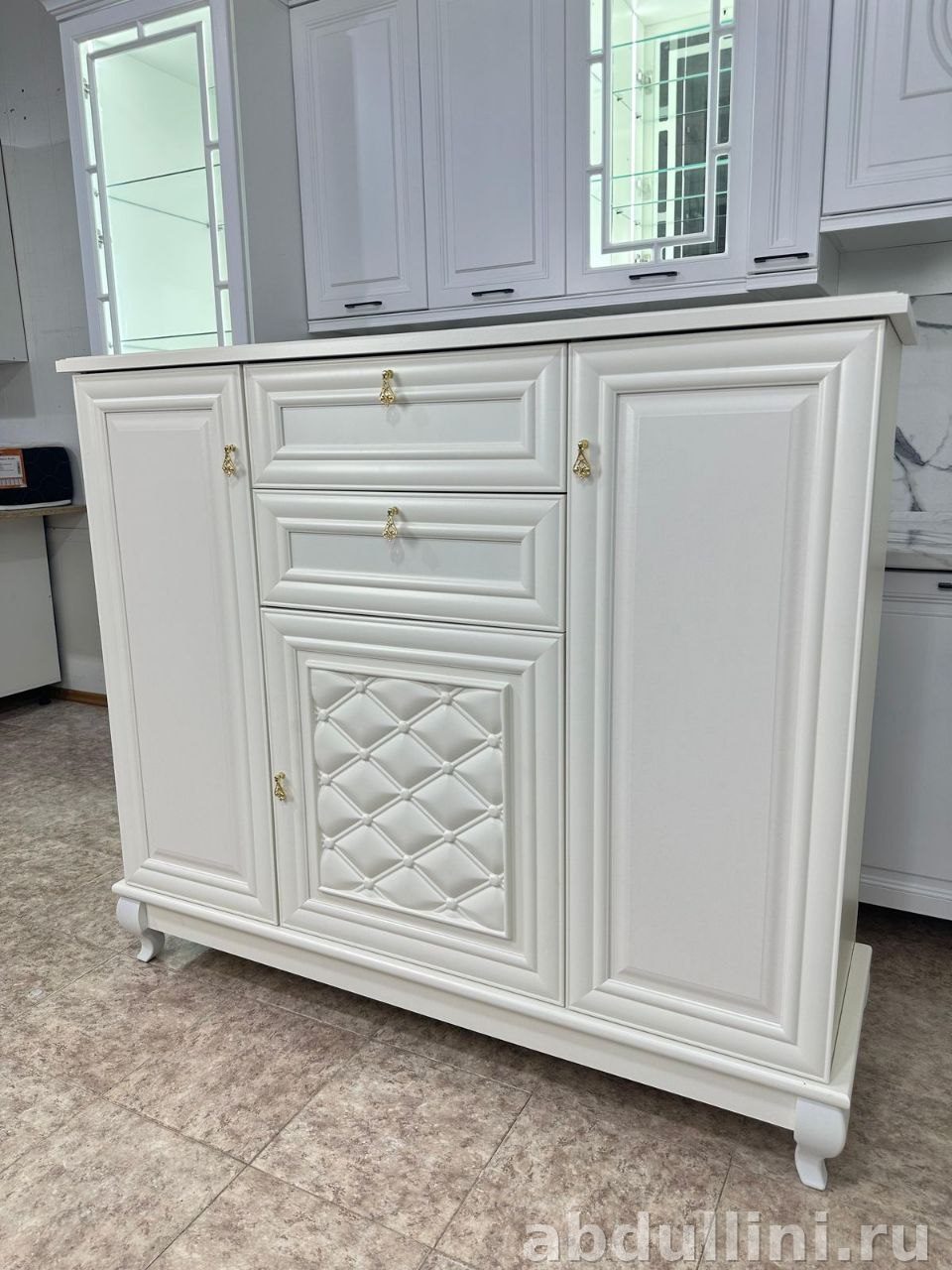 Комод изготовлен из МДФ с матовым эмалевым покрытием. Цвет — латте, светло-бежевый, удобный и нейтральный. Фасады украшены филенчатыми рельефными рамками, а центральная дверца дополнена мягкой вставкой с ромбовидной стяжкой, имитирующей каретную обивку. Золотистые ручки в виде капель добавляют изделию изысканности.