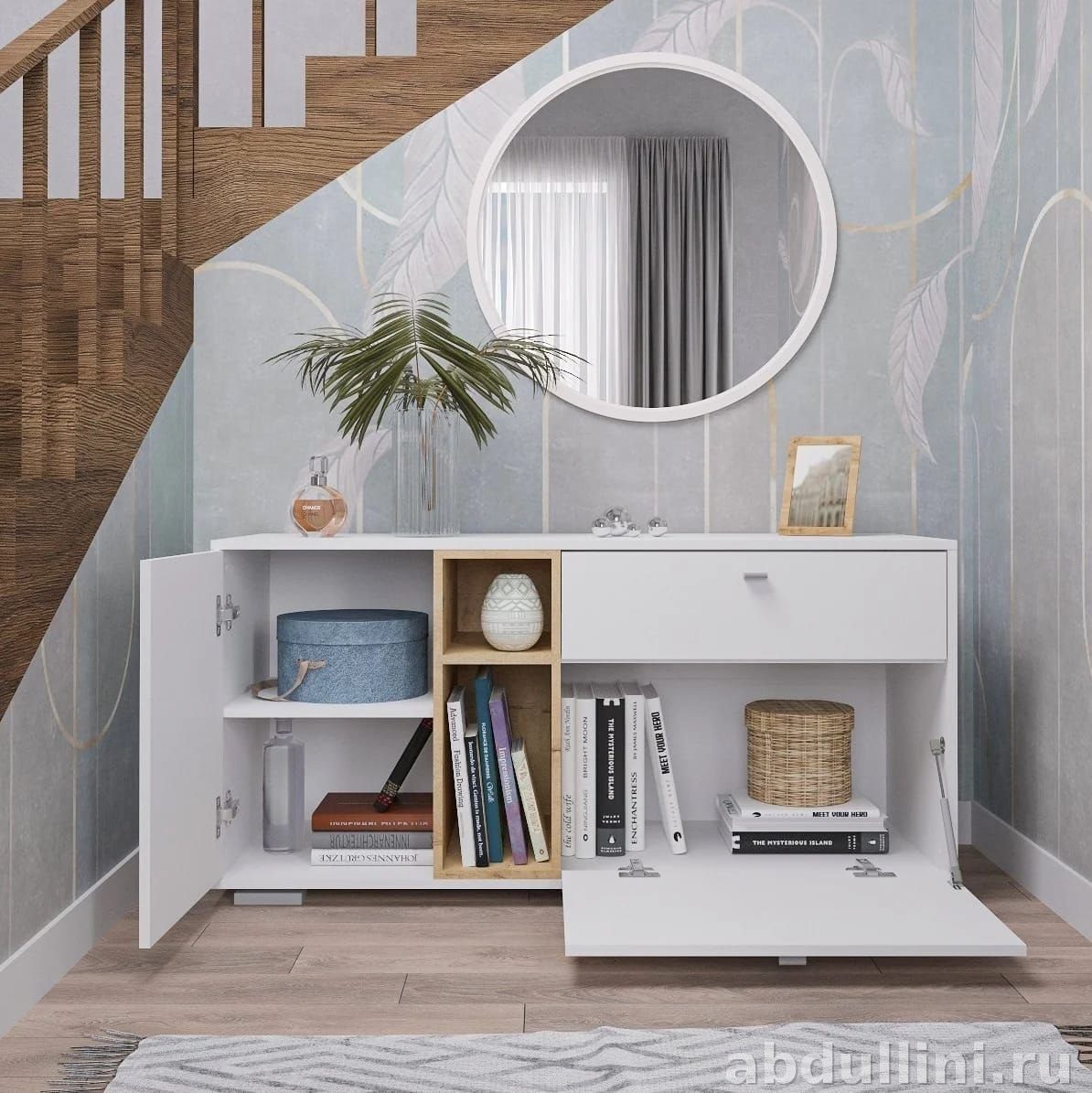 Комод Ланс К101 в стиле минимализм с элементами скандинавского дизайна. Корпус — ЛДСП 16 мм в цвете «Белый» и «Дуб бунратти». Фасады — белые, матовые. В комплекте: два закрытых отделения с дверцами, выдвижной ящик и открытая полка с двумя секциями. Дверцы на петлях с доводчиками, ящик на шариковых направляях.