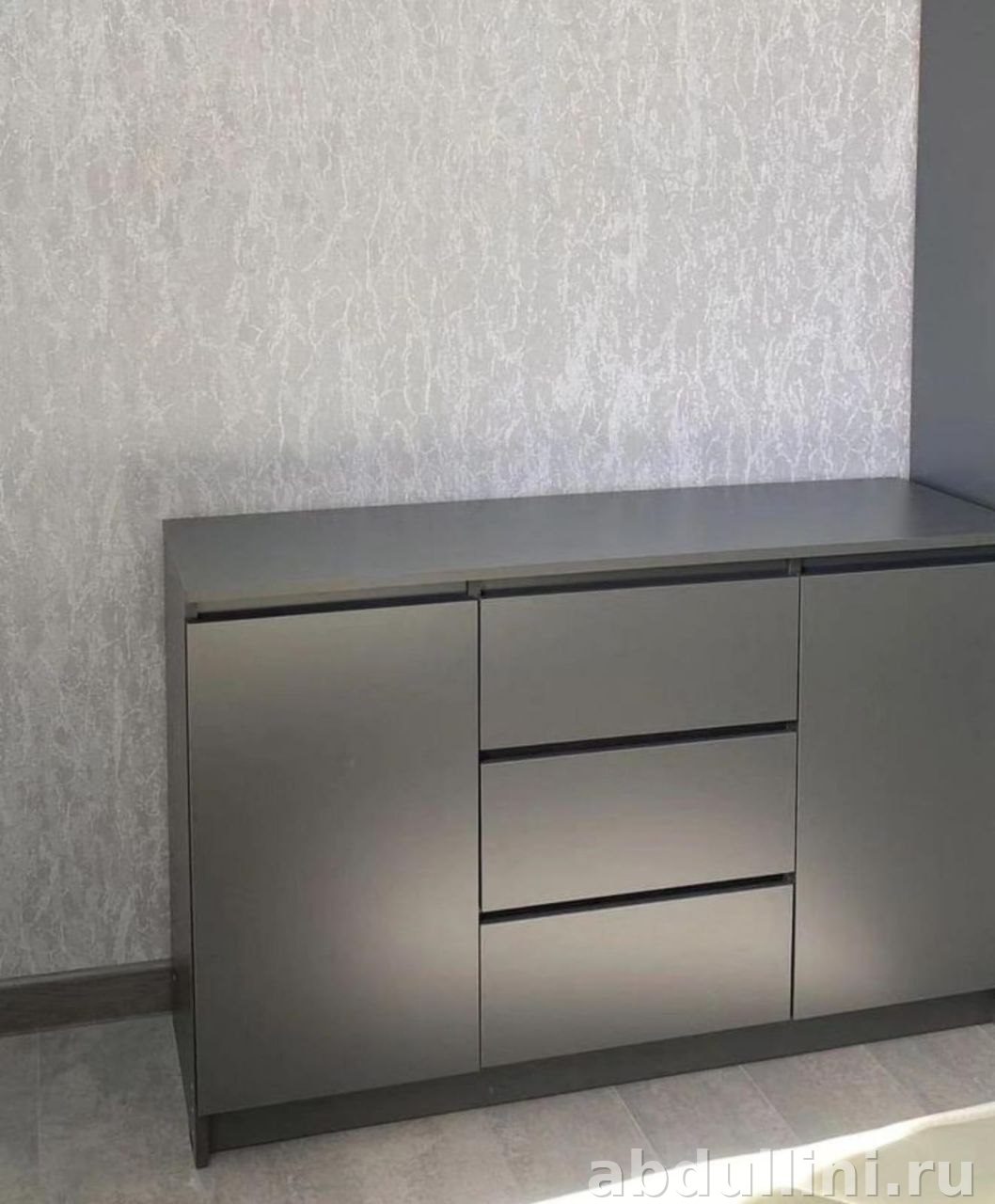Комод состоит из двух секций: одна с дверцей, вторая — с тремя выдвижными ящиками. Фасады и корпус изготовлены из ЛДСП 16 мм. Цвет — графит (есть вариант в белом). Поверхность матовая, без лишнего блеска, что придает комоду сдержанный и стильный вид.