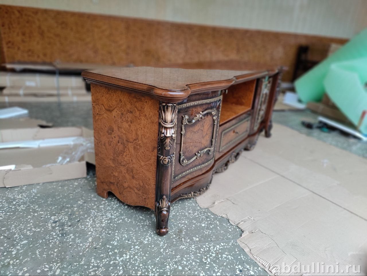 - Материал: Корпус из МДФ или ЛДСП с отделкой шпоном ценных пород дерева. Декоративные элементы — полиуретан с покраской под золото.