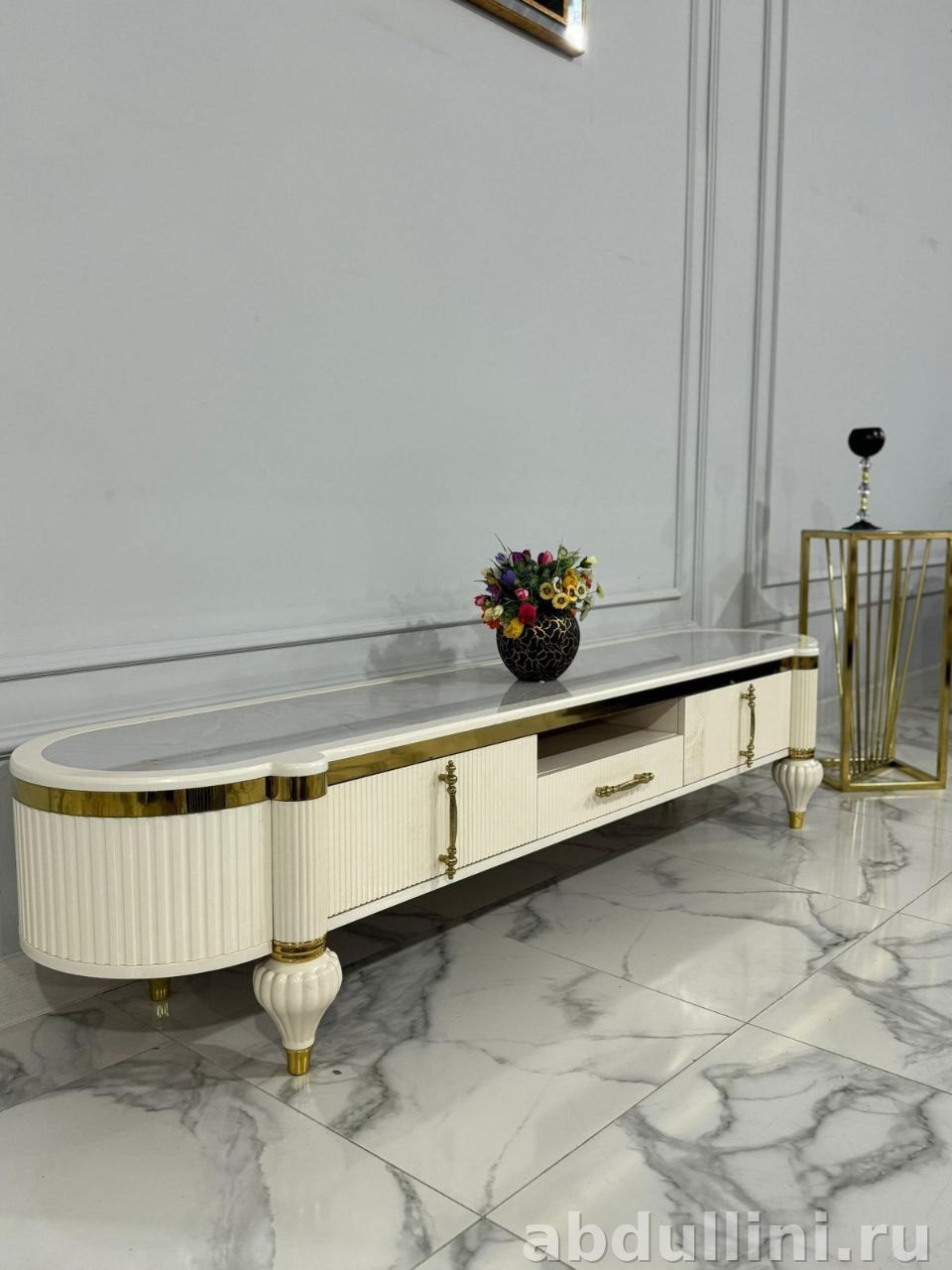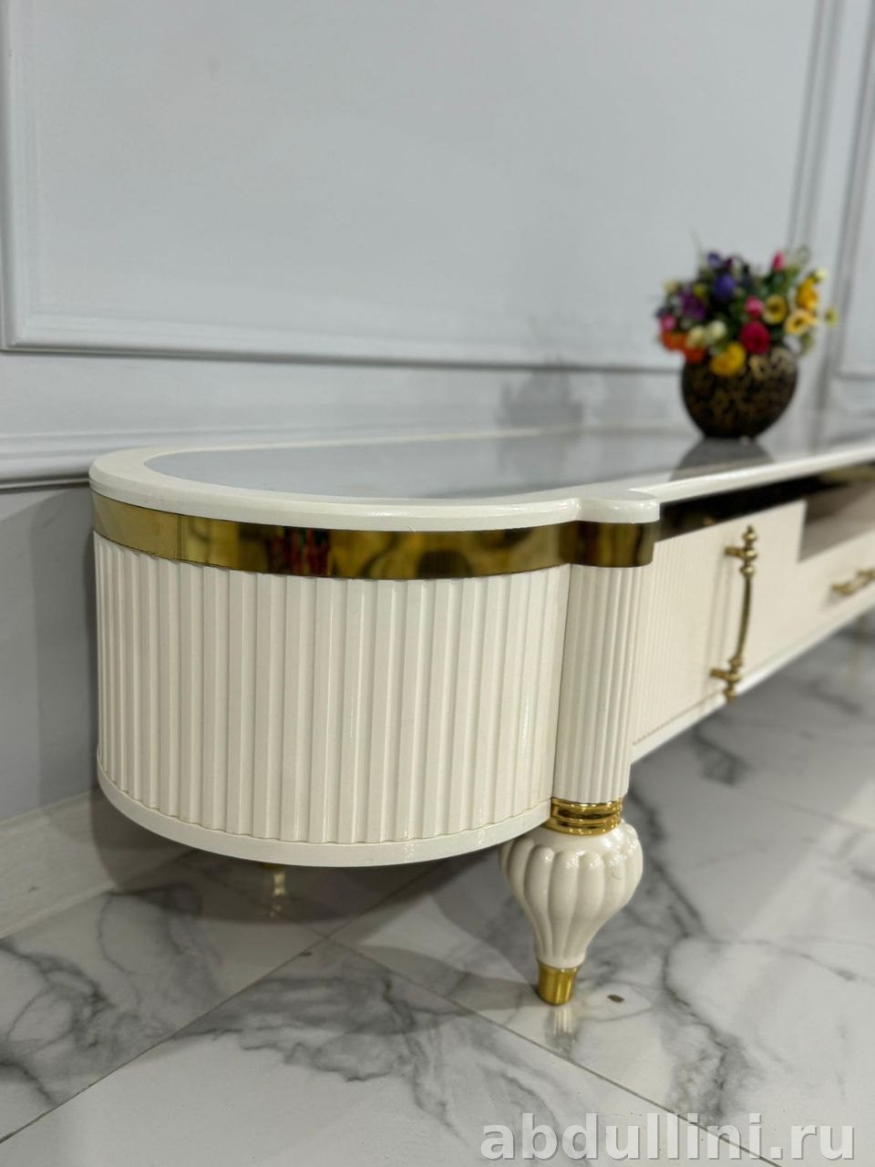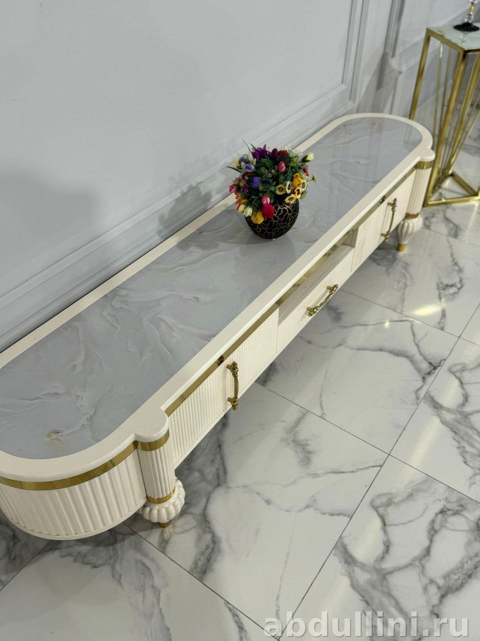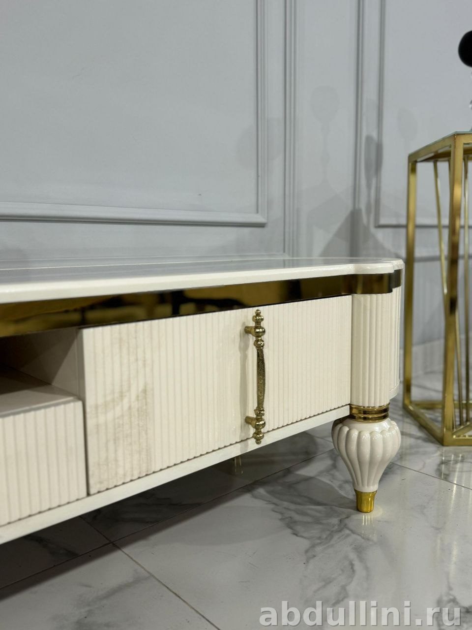 стильная тумба в стиле неоклассика с элементами ар-деко. Цвет — кремовый с ореховыми акцентами. Глянцевое покрытие, золотистая фурнитура и столешница под мрамор.