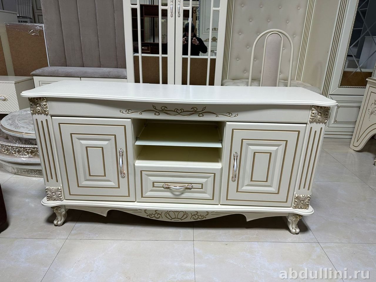 Тумба под телевизор Исанта 359 — стильное и функциональное решение для гостиной. Светлый кремовый оттенок (близкий к ванили) с матовой поверхностью и золотистой отделкой по контуру фасадов. Декоративные резные узоры в верхней части, по бокам и внизу добавляют изысканности.