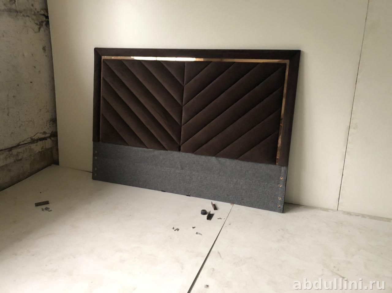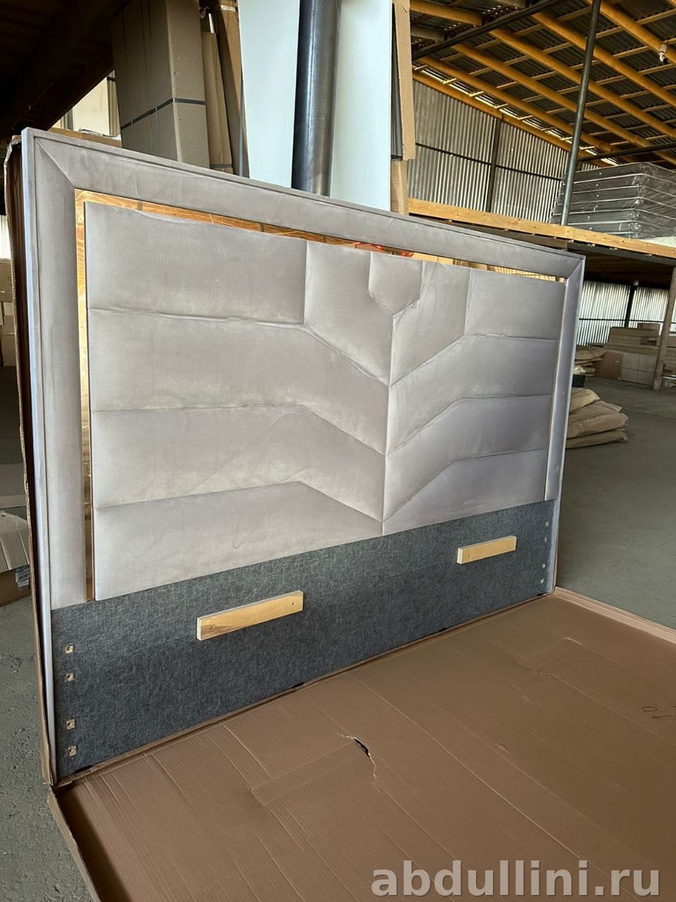 - Особенности: высокое изголовье с декоративной золотистой рамкой, прямоугольное основание с мягкой обивкой, деревянные ламели для поддержки матраса.