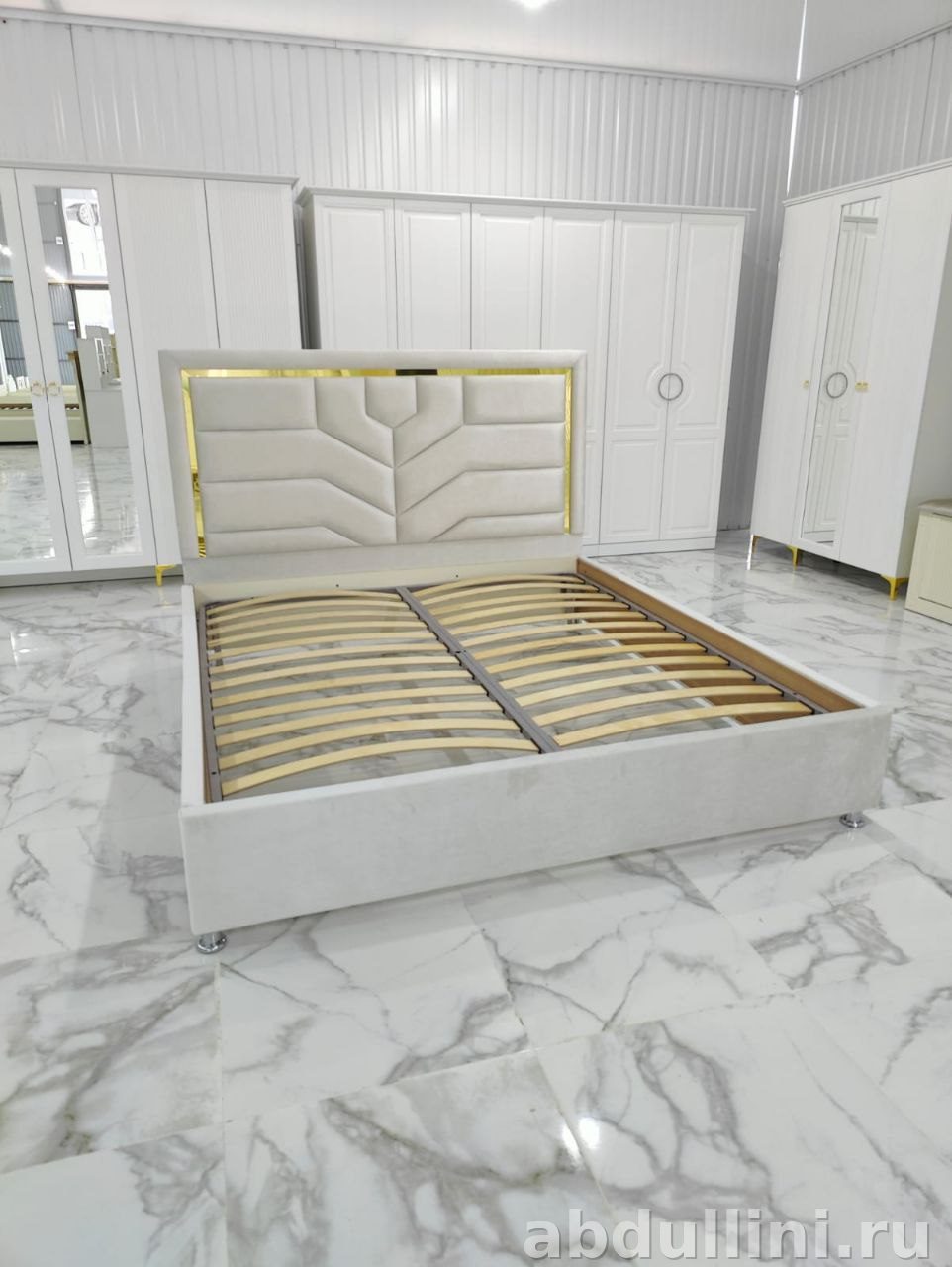 Кровать подойдет для спальни в нейтральных тонах. Геометрическая стяжка на изголовье и золотистый акцент добавляют интерьеру выразительности. Можно заказать в Дагестане с доставкой.