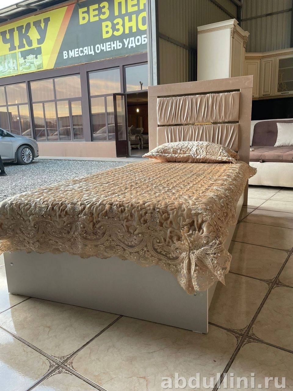 Односпальная кровать 90×200 см в светлых бежевых тонах. В комплекте идет матрас и подушка с узорчатой тканью и кружевной отделкой. Основание — белое, матовое, из ЛДСП или МДФ.