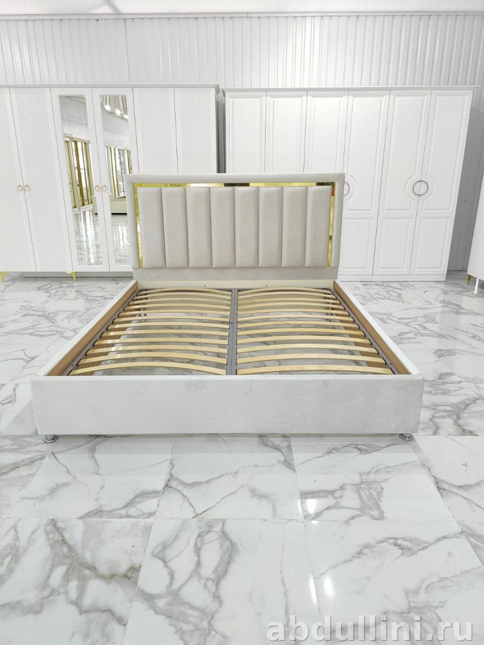 - Конструкция: Прямоугольная форма с низким основанием. Изголовье состоит из вертикальных мягких панелей, разделенных золотистыми вставками. Кровать установлена на металлические ножки.