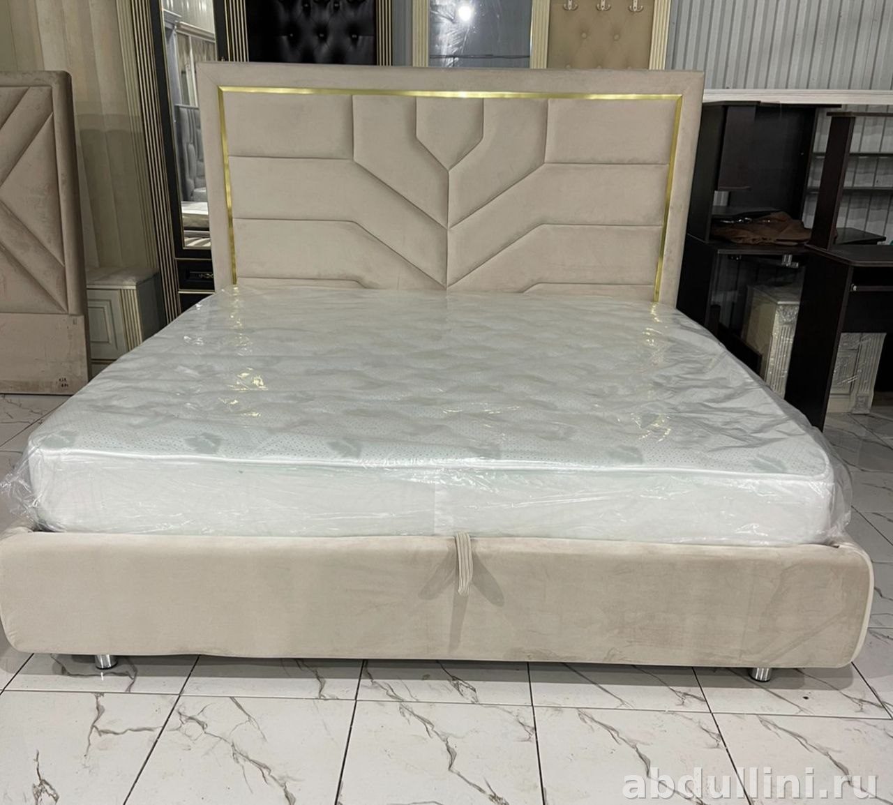 Цветовая гамма включает классические оттенки: светло-бежевый, темно-серый и бежевый с золотой отделкой. Обивка из матовой ткани придает изделию тёплый вид. Декоративные вертикальные полосы на изголовье добавляют объем и стиль.