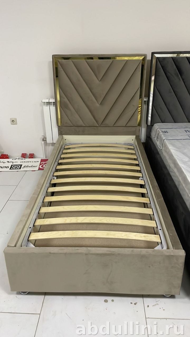 Два варианта обивки: темно-серый и бежевый велюр. Ткань мягкая, приятная на ощупь. Изголовье украшено V-образным узором и рамкой — зеркальной или золотистой, в зависимости от цвета.