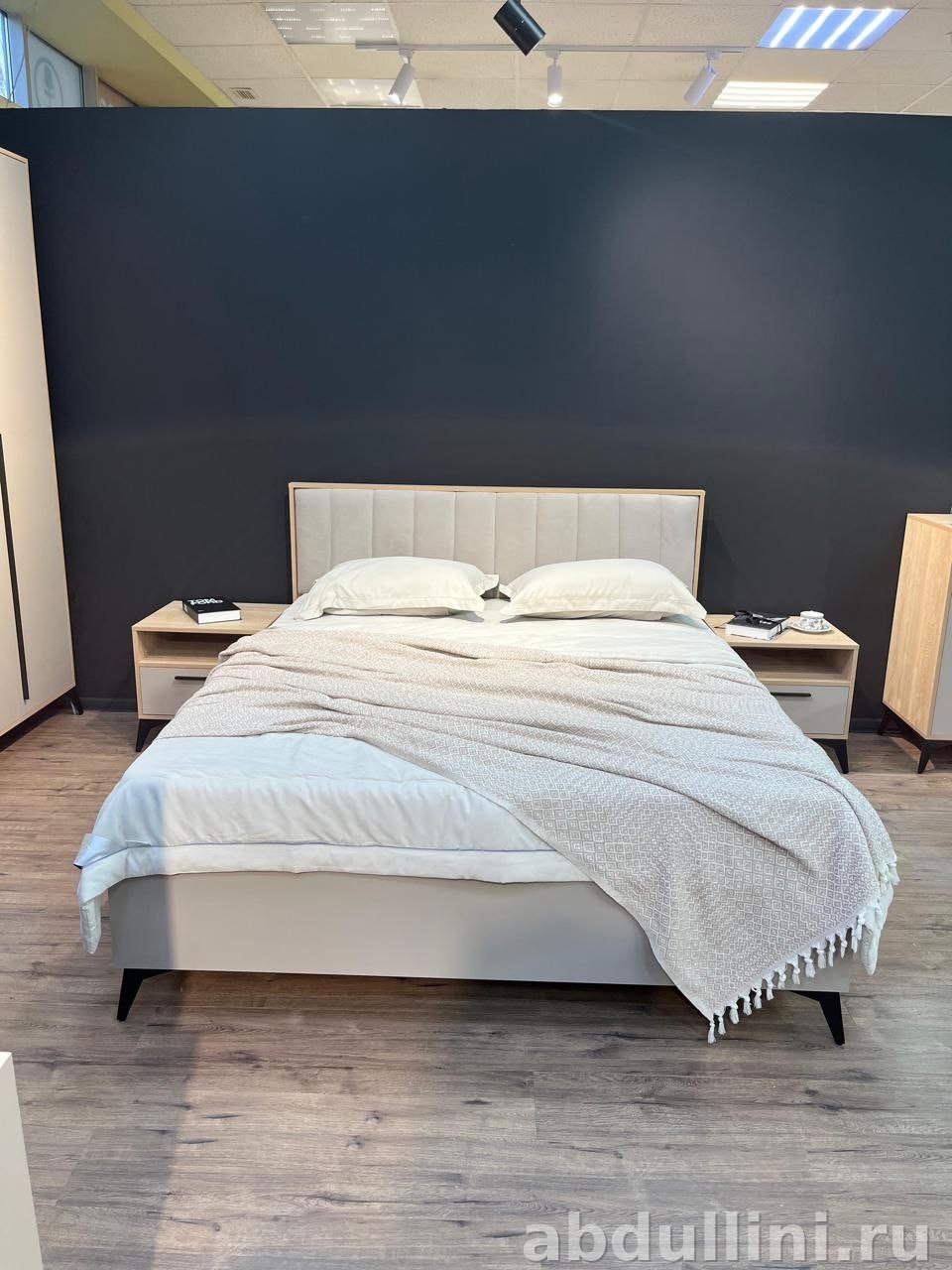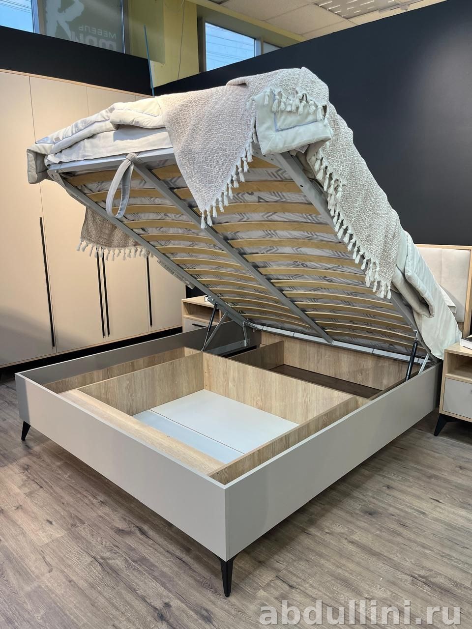 - Кровать: Размер 1600×2000 см, подъемный механизм с газовыми амортизаторами, основание на ламелях, обивка изголовья — ткань светло-бежевого цвета.