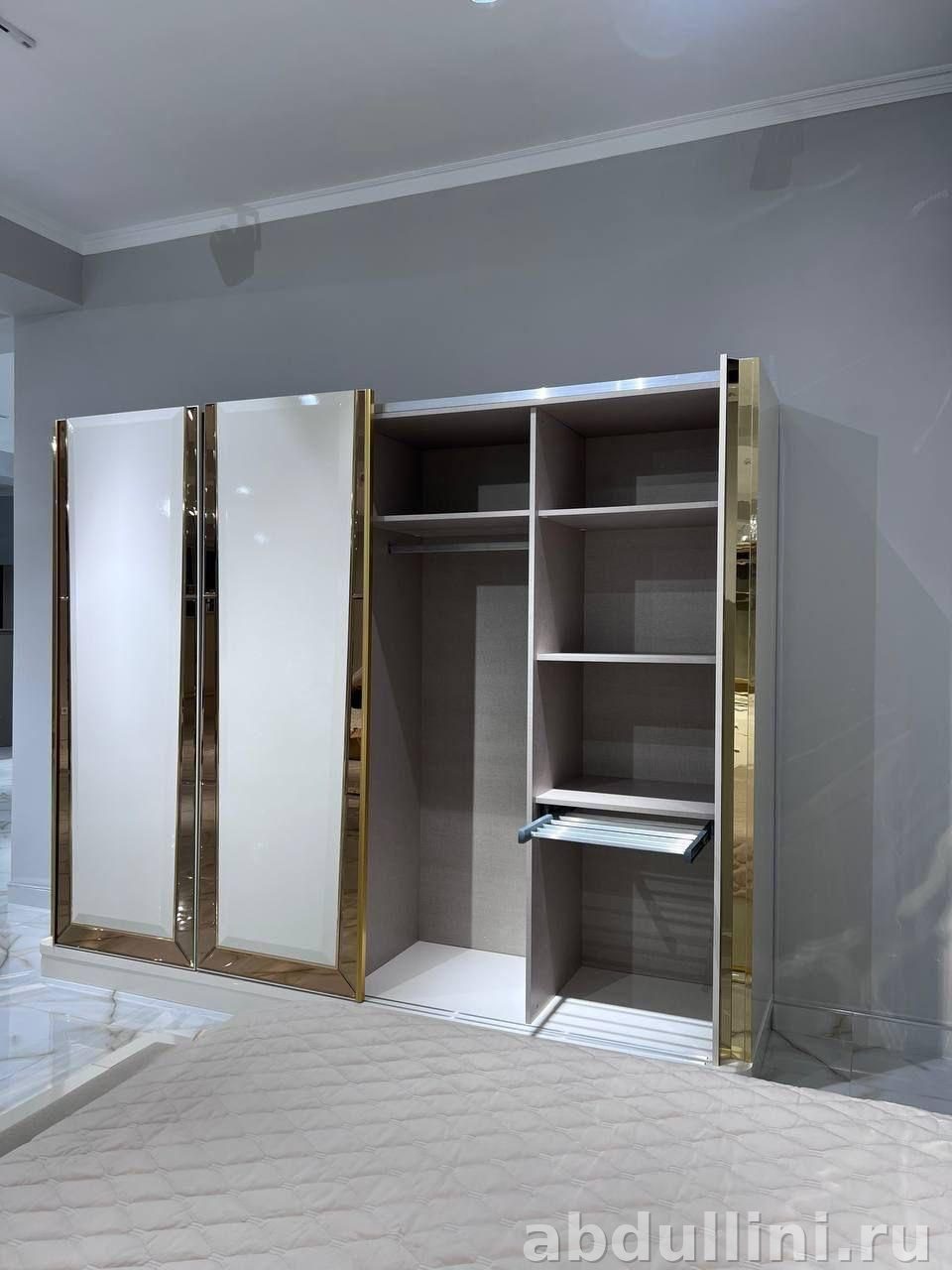 - Материалы: глянцевый ЛДСП/МДФ (белый), золотая фурнитура, зеркальные вставки