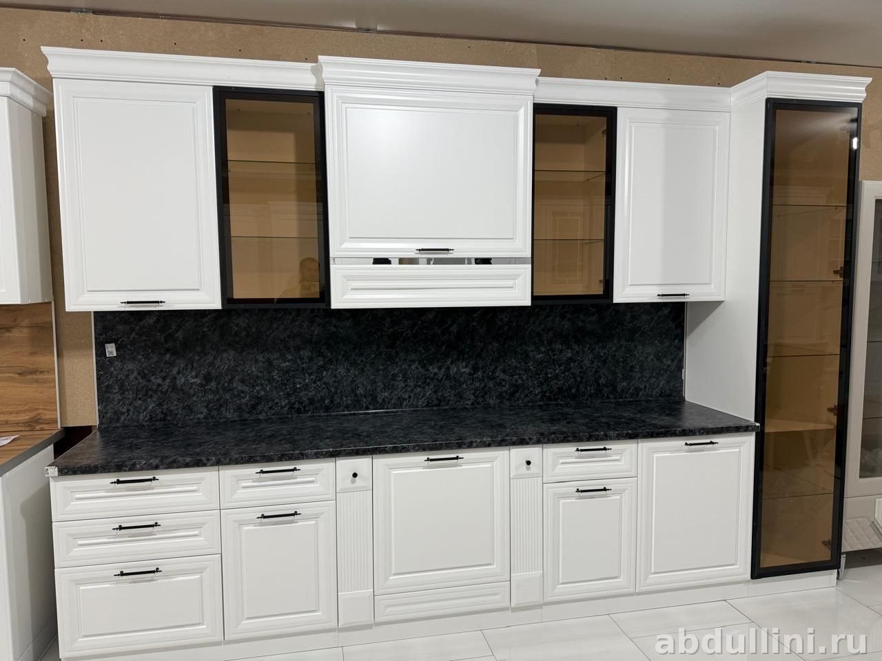 Белый кухонный гарнитур российского производства. Комплектация включает верхние и нижние шкафы, столешницу и фартук. Практичное решение для современного дома.