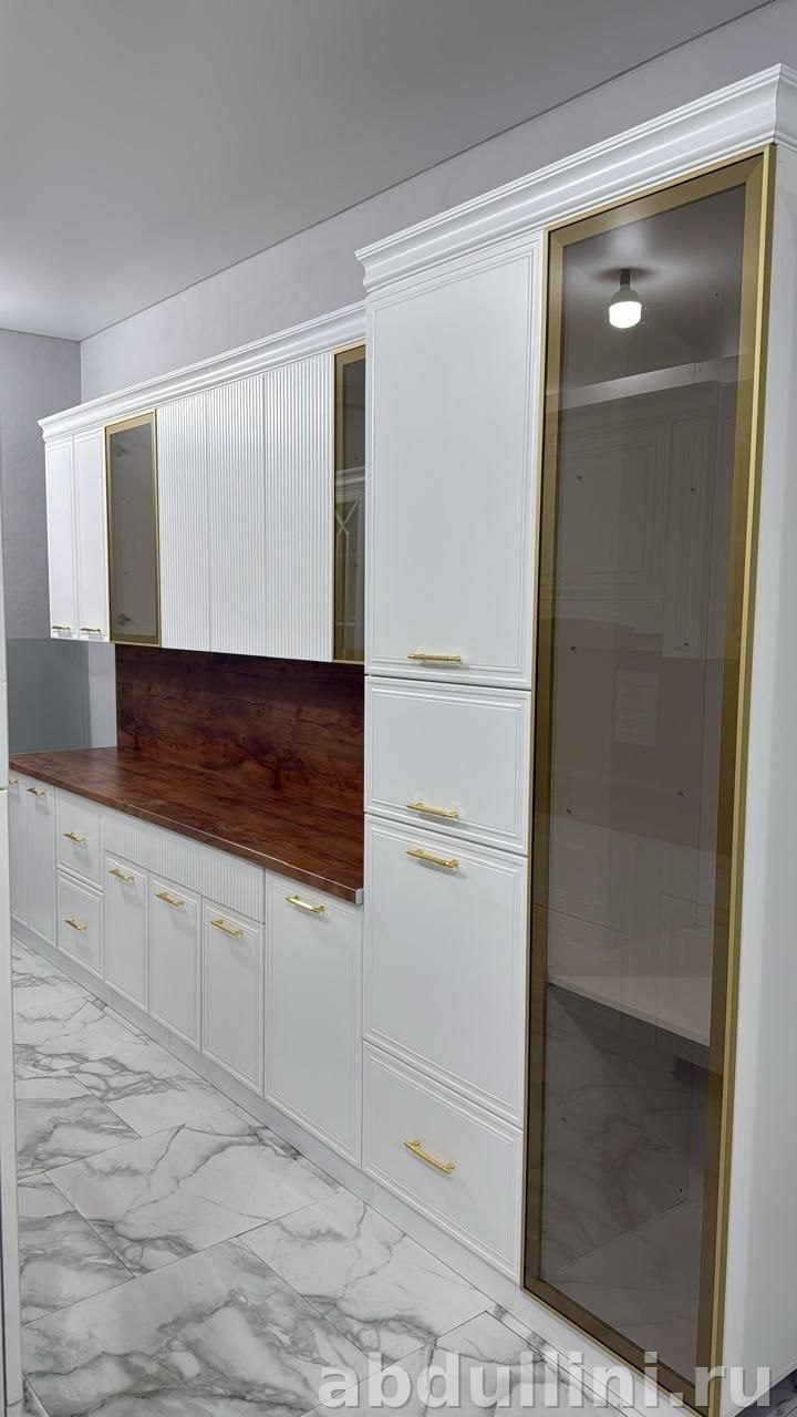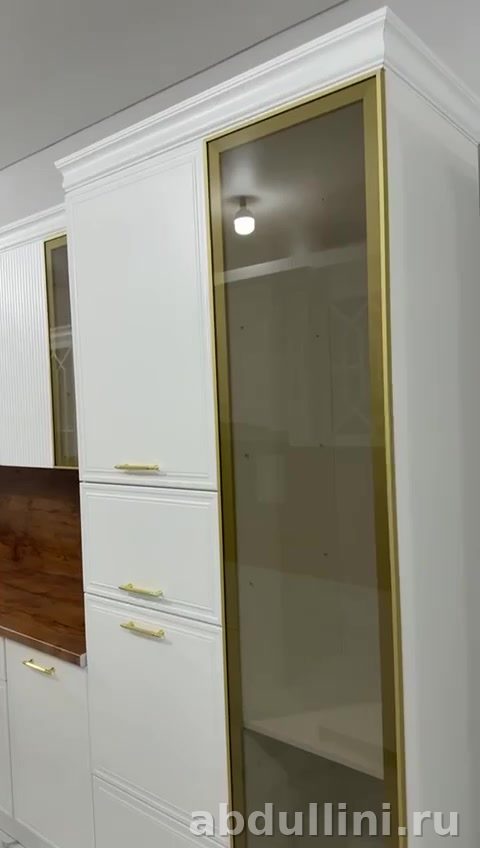 - Белые фасады с золотистой окантовкой на стеклянных дверцах.