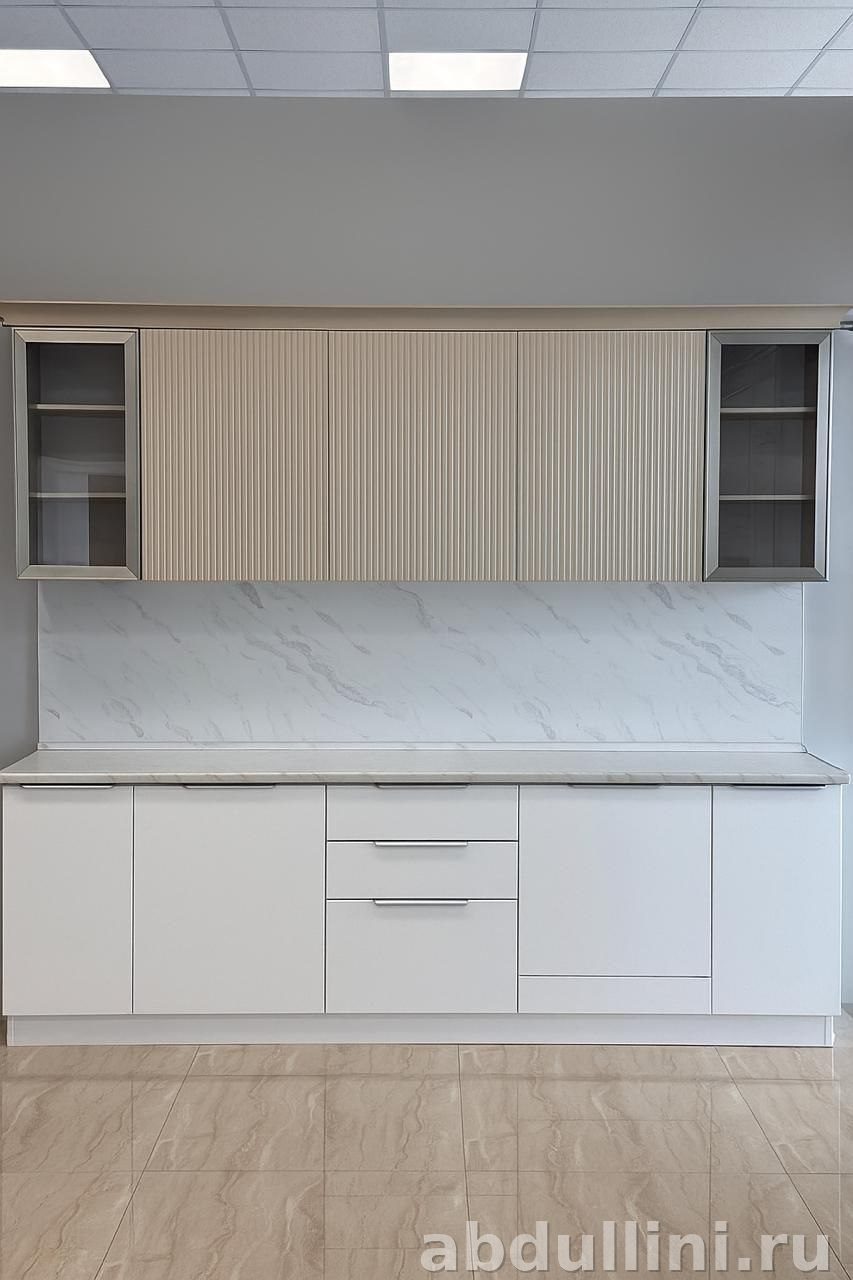 Цветовая гамма: фасады нижних шкафов — белый матовый, верхних — светло-бежевый с вертикальными полосами. Корпус шкафов белый, фурнитура — металлические ручки матовый хром.