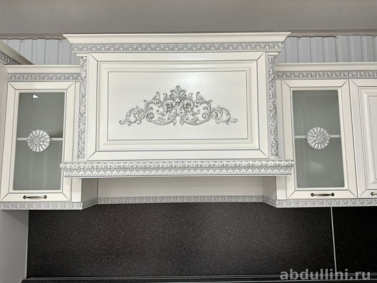 Кухня «Эмилия» — классический гарнитур с элементами неоклассики. Основной цвет — белый с серебристыми декоративными вставками. Фасады из МДФ с матовой отделкой, корпус — ЛДСП, столешница — черная с эффектом гранита.