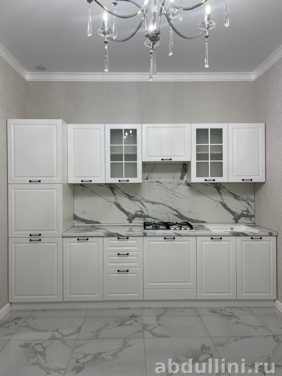 - Материал: фасады из МДФ с матовой эмалью, корпуса из ЛДСП. Столешница и фартук с имитацией мрамора.