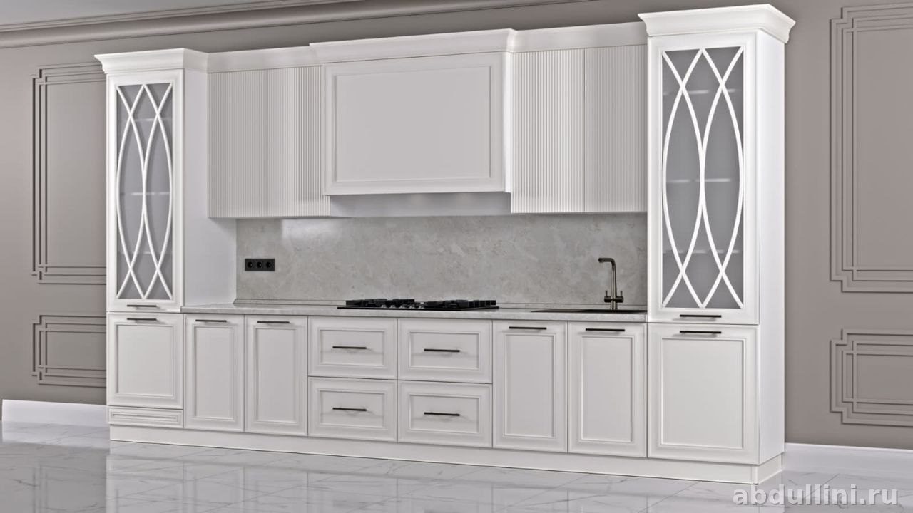 - Декоративные элементы: вертикальная фрезеровка на фасадах, стеклянные дверцы с узором из овалов, чёрные матовые ручки.