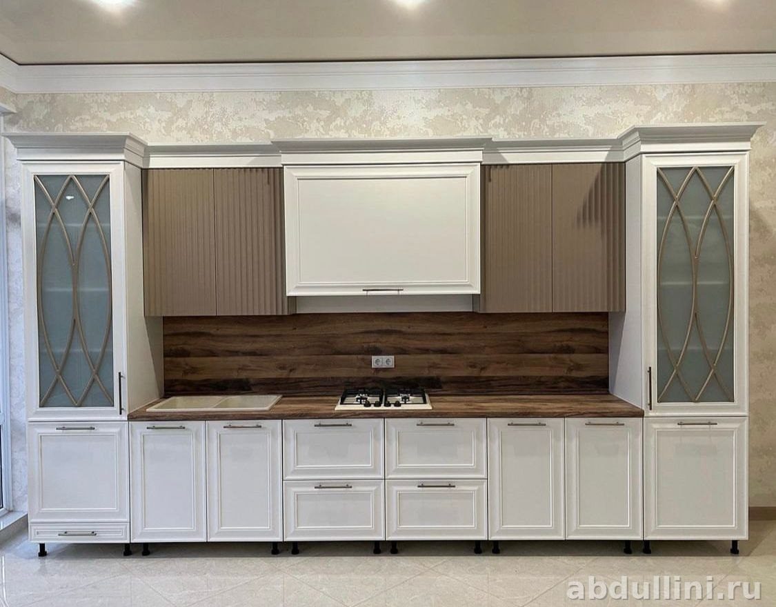 - Цвет: белые матовые фасады с коричневыми вставками (вертикальные полосы). Столешница и фартук — под дерево с выраженной текстурой.