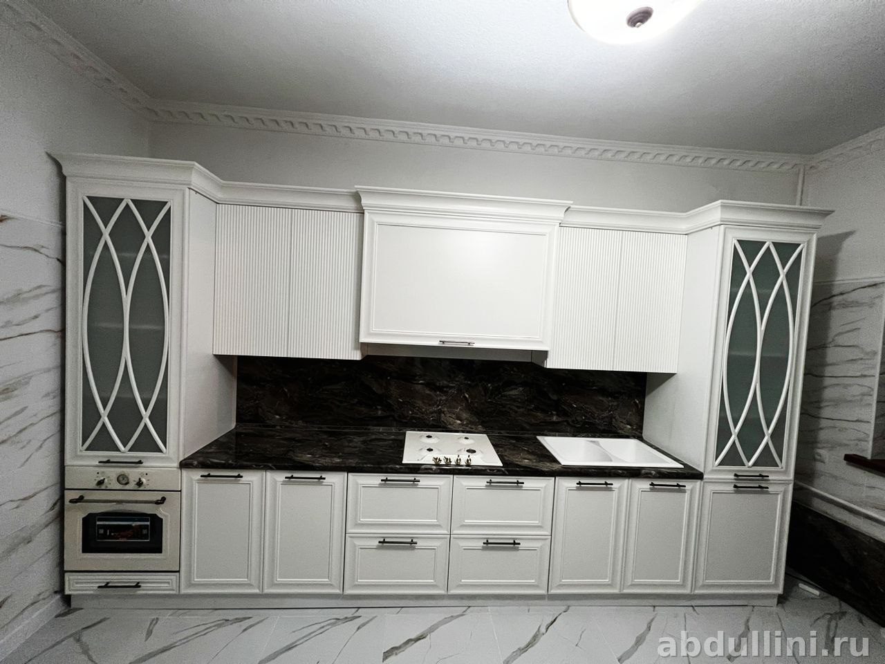 удобная и стильная кухня в кремовом цвете. В комплекте: напольные и навесные шкафы, столешница 38 мм с влагостойким покрытием, стеновая панель в тон. Петли с доводчиками для плавного закрывания.
