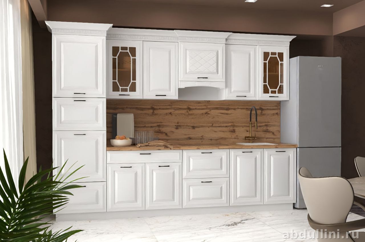 Кухонный гарнитур «Мариам» — это функциональное и стильное решение для вашей кухни. В комплект входят напольные и навесные шкафы, встроенная вытяжка и двухкамерный холодильник. Фасады выполнены в белом матовом цвете, что добавляет гарнитуру сдержанности и благородства. Декоративная фрезеровка на фасадах и стеклянные вставки с геометрическим узором в навесных шкафах подчеркивают изысканность дизайна.