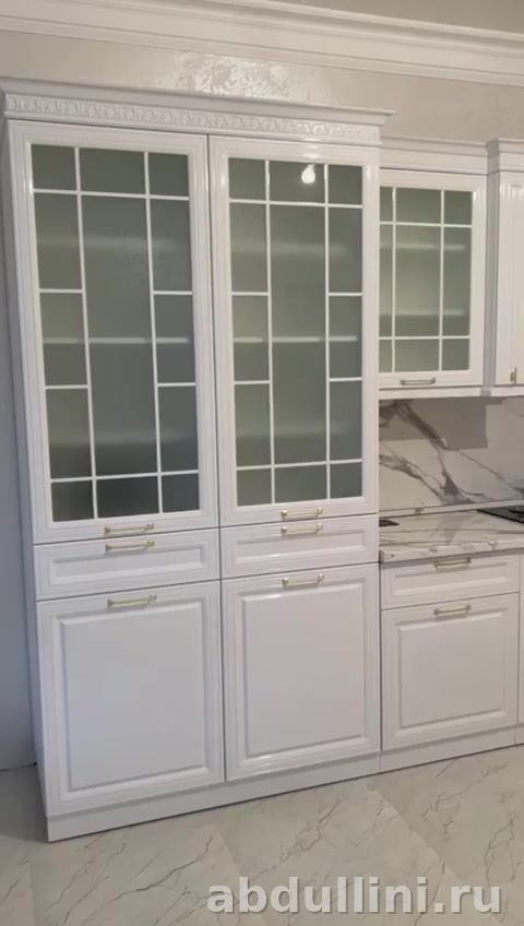 Кухонный гарнитур в современном стиле с глянцевыми фасадами. Четкие линии, простой дизайн — подойдет для просторных и компактных помещений. Белый цвет визуально расширяет пространство, глянец добавляет легкости.