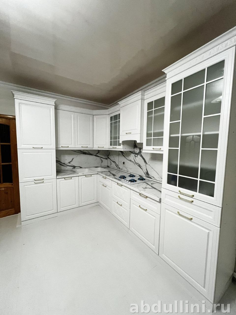 - Навесные шкафы разных размеров, включая варианты со стеклянными фасадами и глухие.