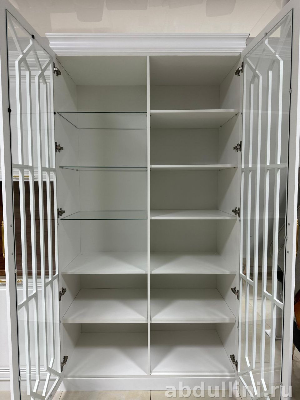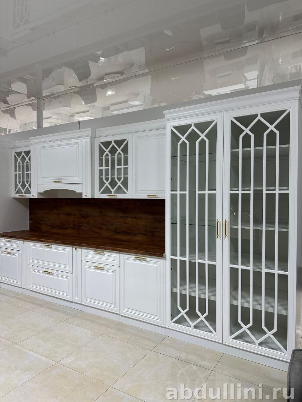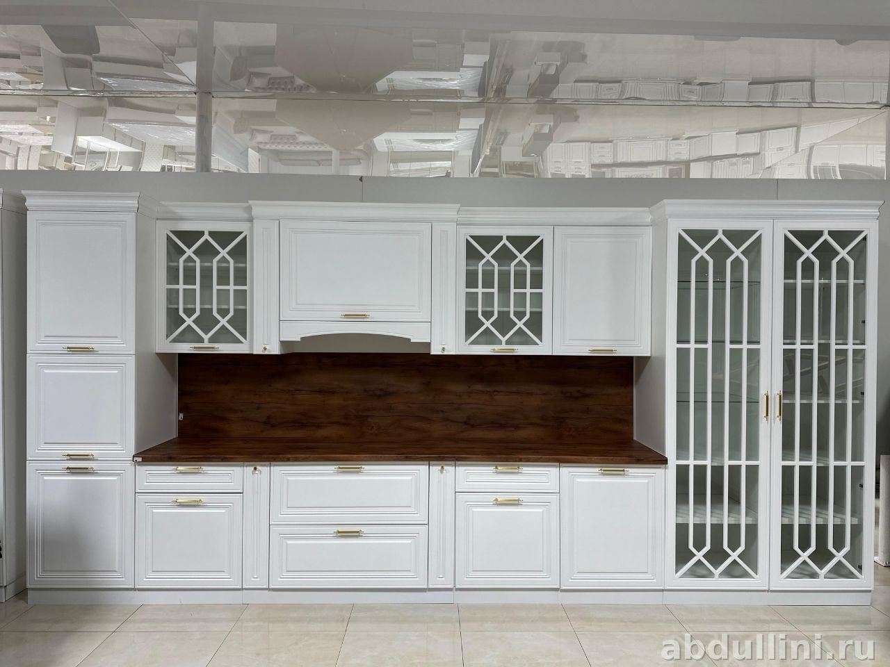 - Комплектация: высокий шкаф-пенал с глухой дверцей, навесные шкафы с декоративной решеткой и глухими фасадами, шкаф-витрина со стеклянными дверцами, нижние шкафы с распашными дверцами и выдвижными ящиками.