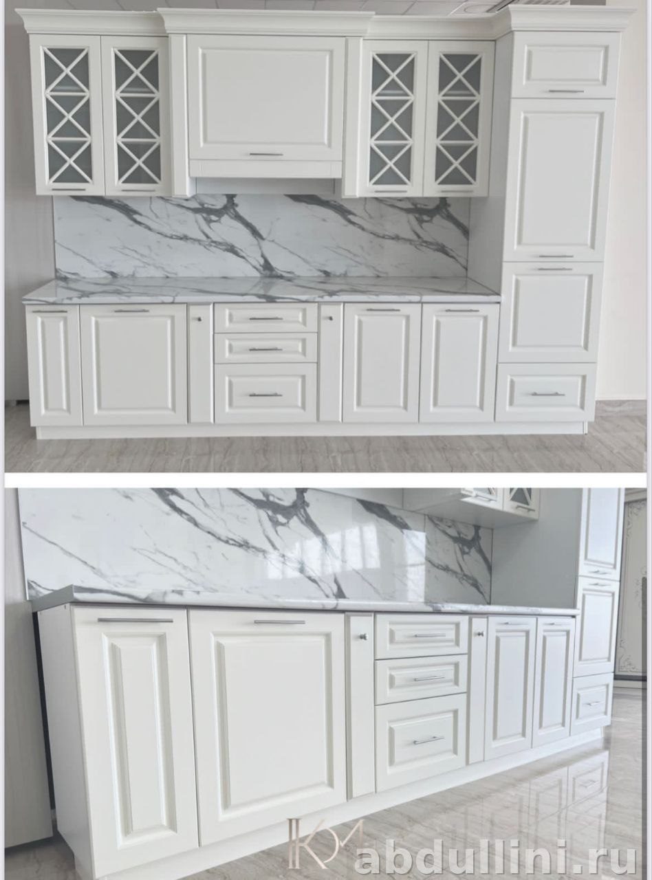 - Цвет: белый матовый, декоративные элементы — филенчатые фасады с фрезеровкой, стильные хромированные ручки.