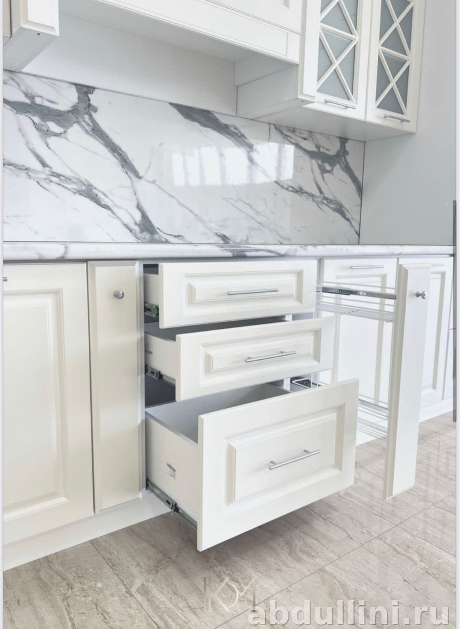 - Материалы: фасады из МДФ с матовой эмалью, корпус из ЛДСП, столешница из постформинга с имитацией мрамора.