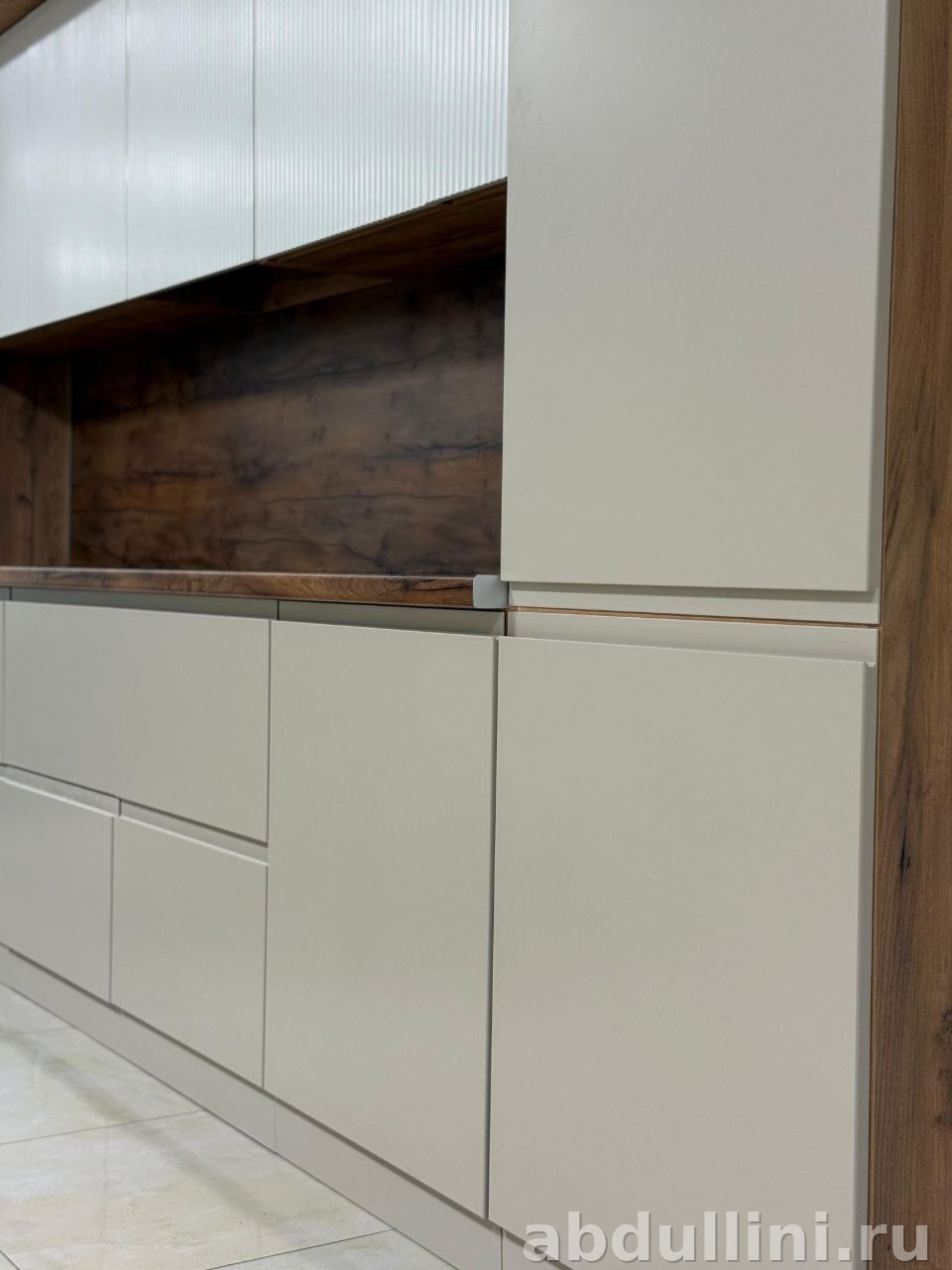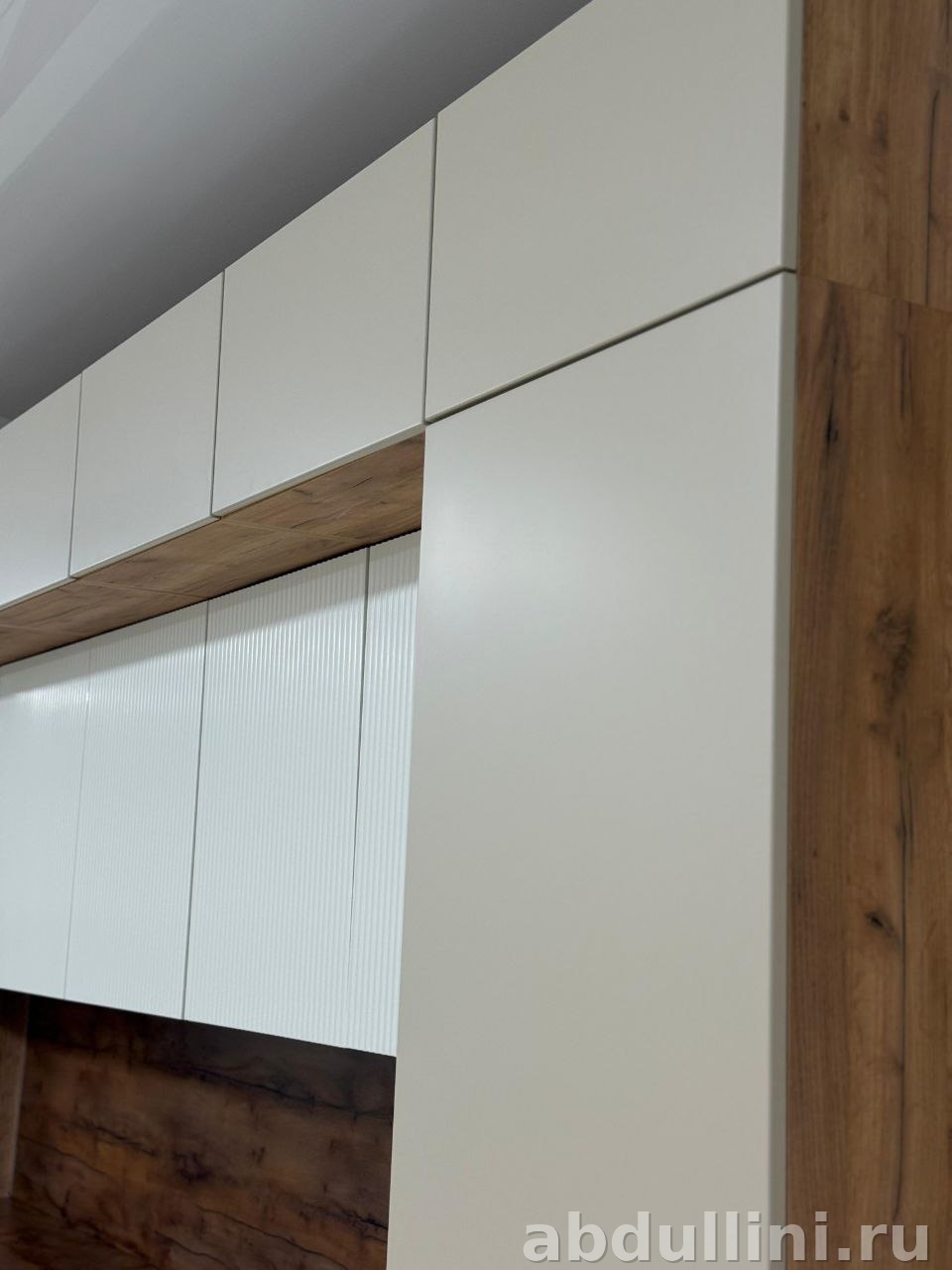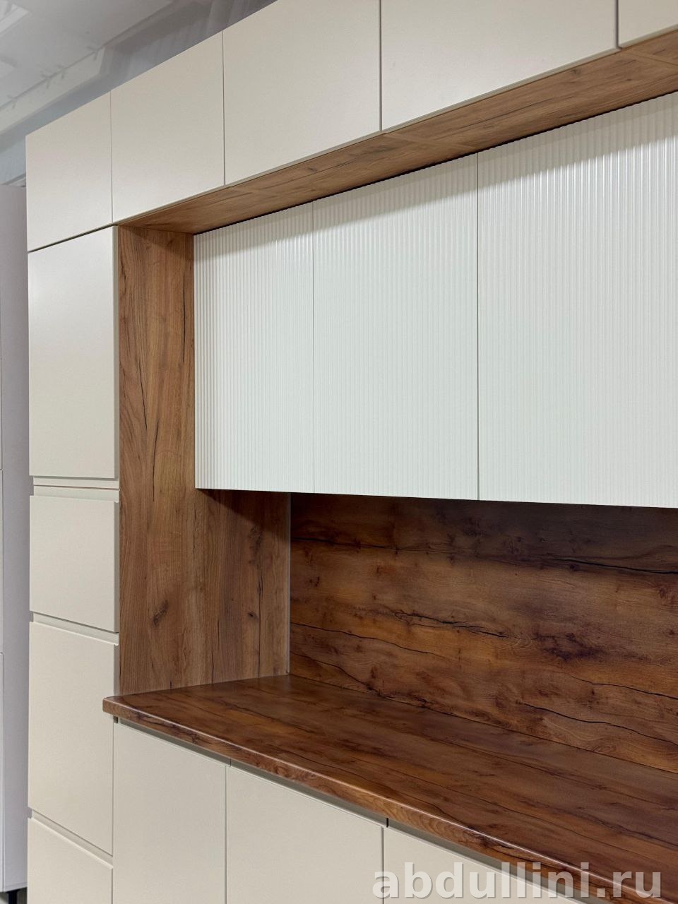 - Верхние шкафы — гладкие фасады, белая центральная часть с вертикальными полосками.