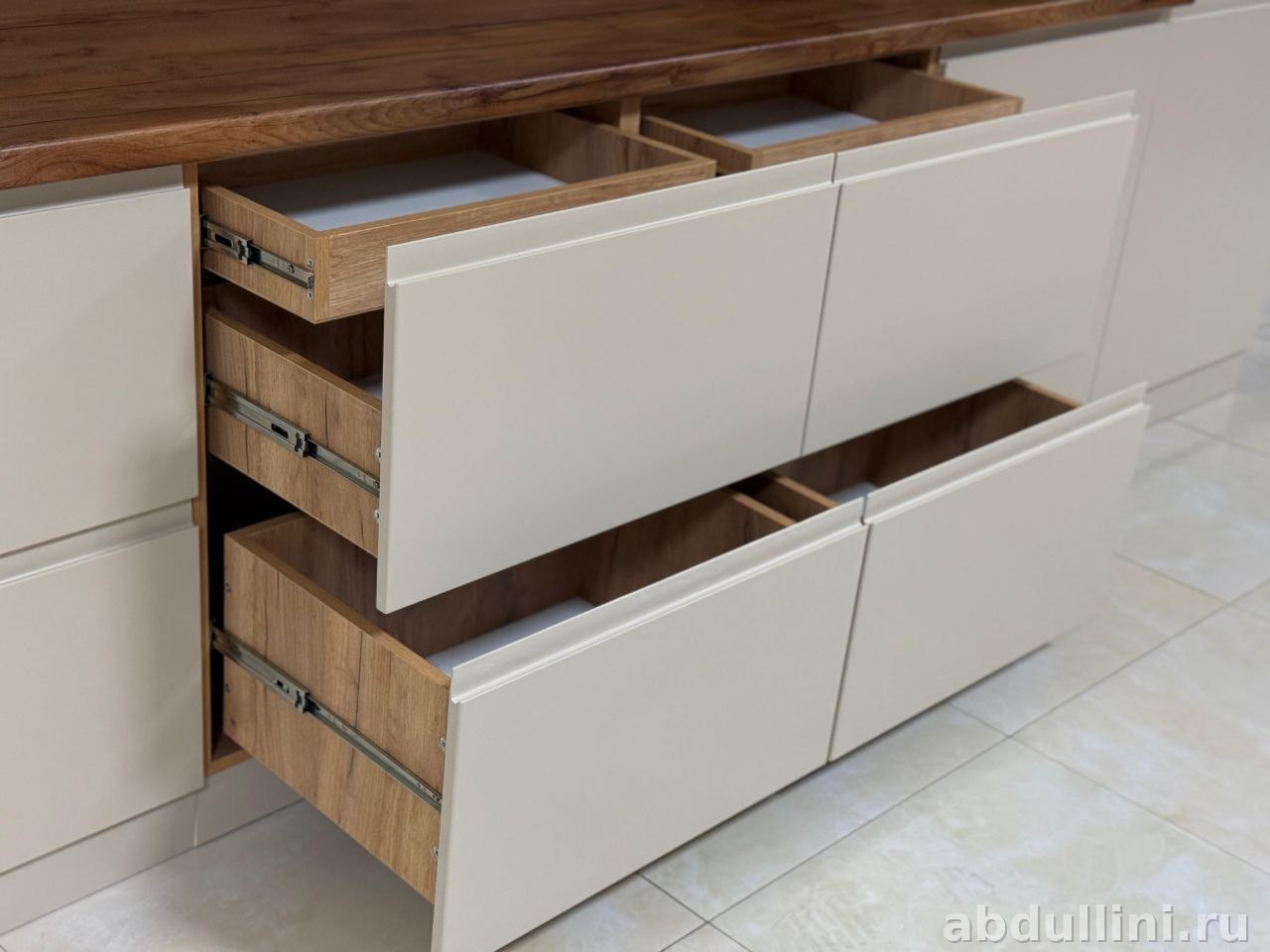 Материалы: корпус и фасады — МДФ с матовым покрытием, столешница — ЛДСП с ламинацией под дерево. Фурнитура — без ручек (система push-to-open).
