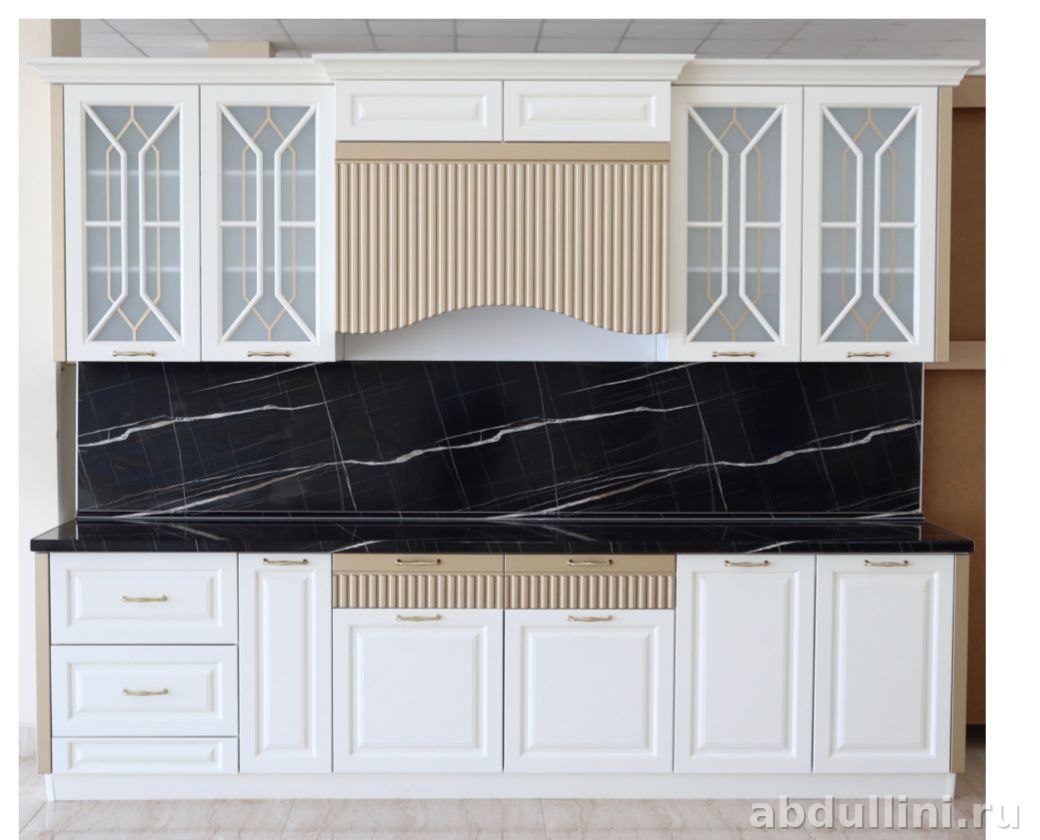 Цветовая гамма гарнитура сочетает белые матовые фасады с золотистыми вставками и фурнитурой, что добавляет изысканности. Столешница и фартук выполнены в черном цвете с белыми прожилками, имитирующими мрамор. Материалы: фасады из МДФ с эмалевым покрытием, корпус из ЛДСП, столешница из ДСП с пластиковым покрытием.