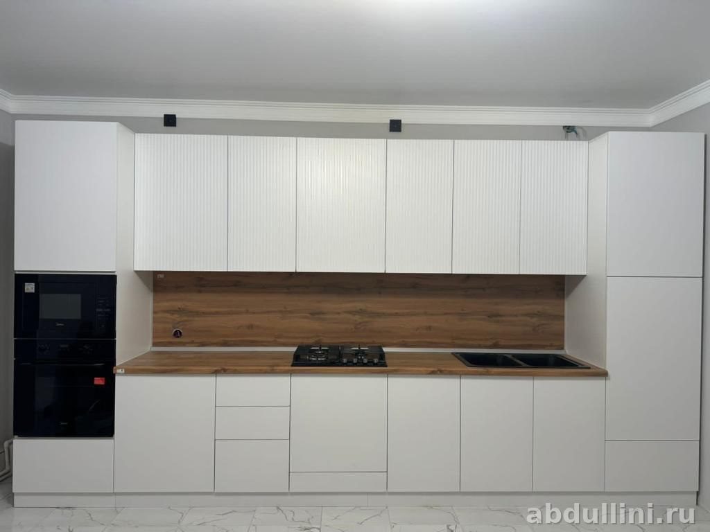 модная кухня в стиле минимализм. Фасады — матовый белый, столешница с декором под дерево. Комплектация: верхние и нижние шкафы, встроенная техника (духовой шкаф и микроволновая печь), варочная панель, мойка.