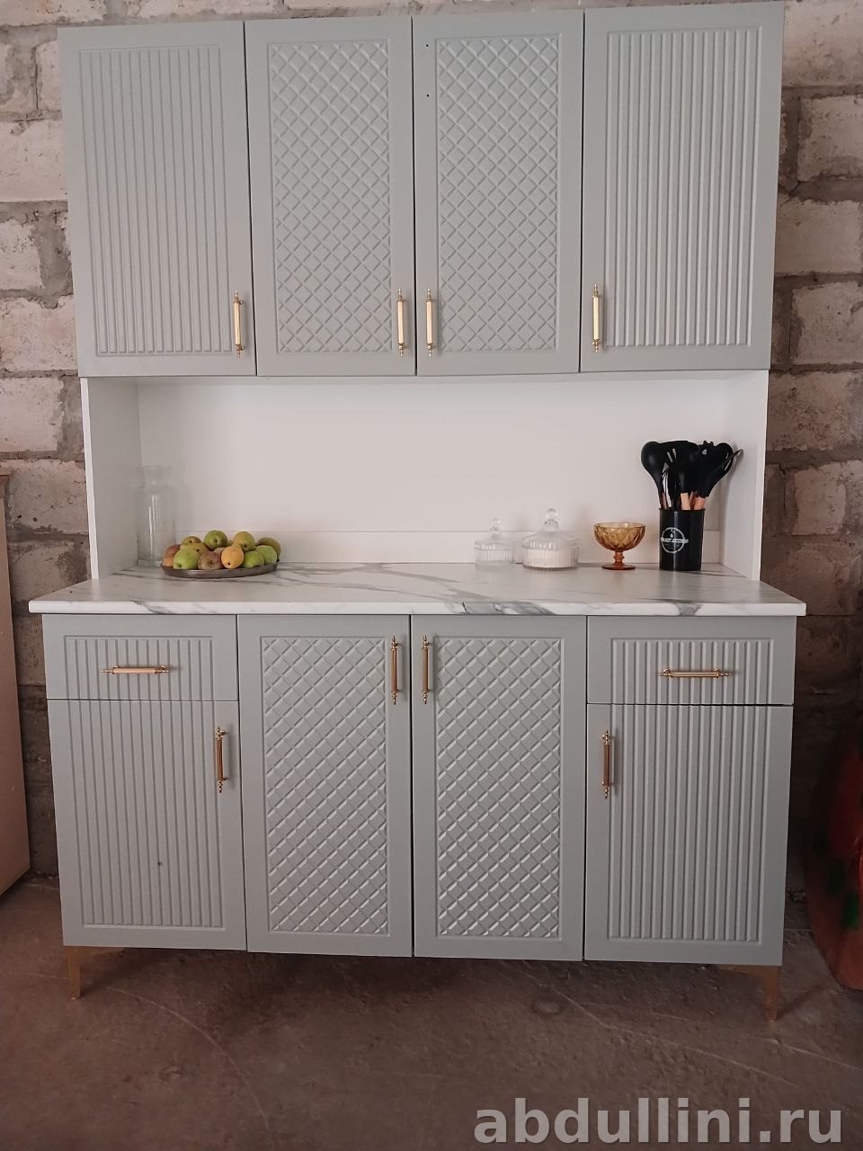 Гарнитур собран из ЛДСП и МДФ. Верхний ярус — четыре навесных шкафа, нижний — три секции: две с распашными дверцами, одна с выдвижным ящиком. Ножки золотистые.