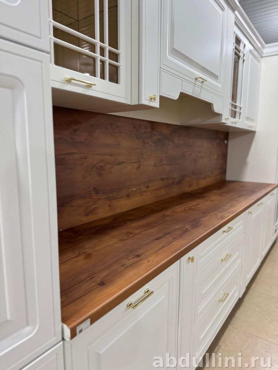 Цвет фасадов — белый с кремовым оттенком, отделка матовая. Фасады выполнены из крашеного МДФ, корпус — из ЛДСП. Столешница и стеновые панели имитируют дерево, что добавляет гарнитуру теплоты и уюта.