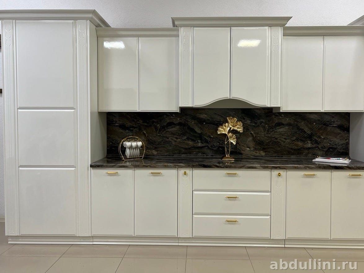 Гарнитур выполнен в стиле неоклассика. Фасады — глянцевые, цвет «Белый-жемчуг», что придает кухне легкость и свет. Столешница и стеновая панель выполнены из материала Paladin темного оттенка, имитирующего мрамор.
