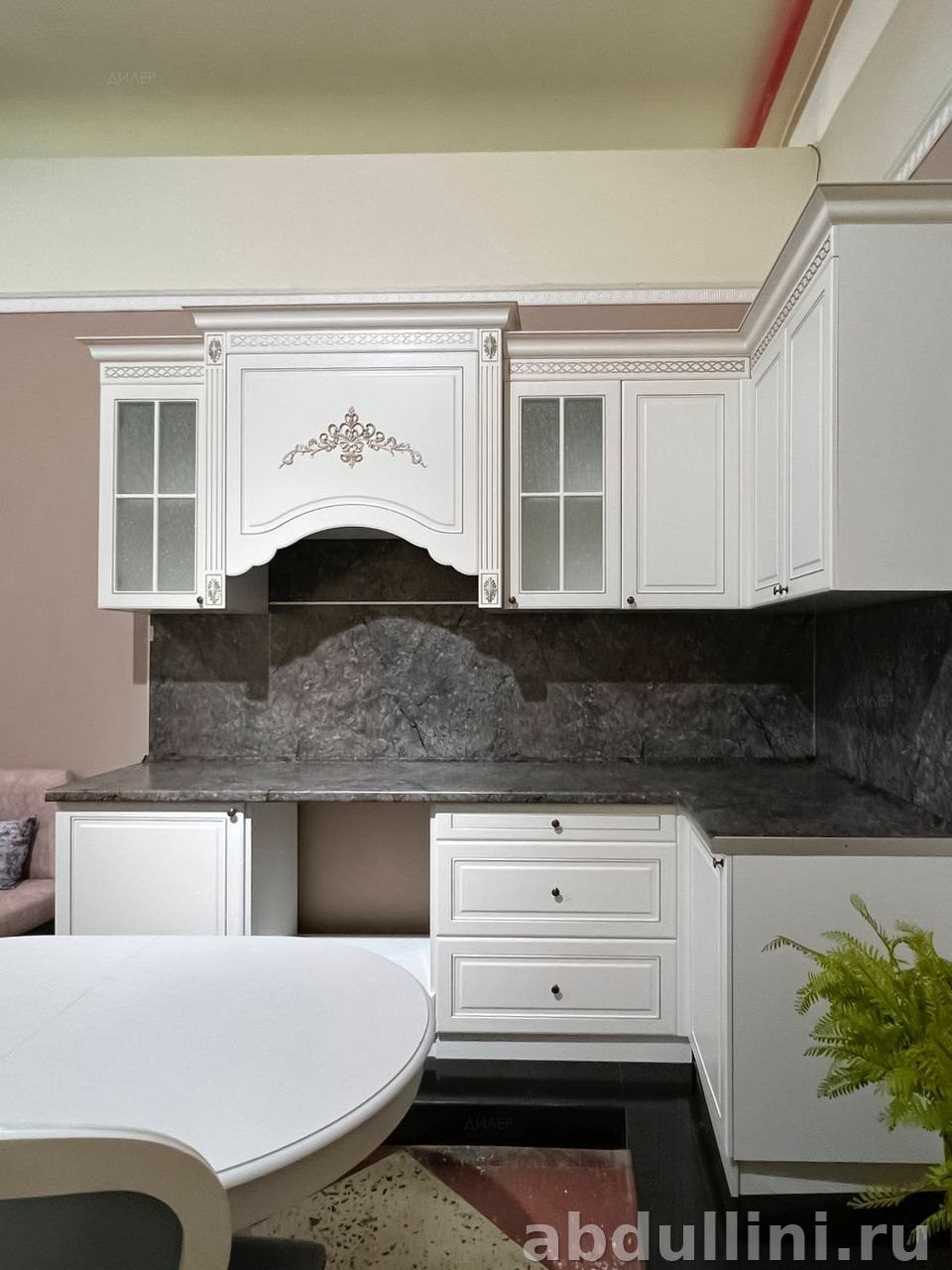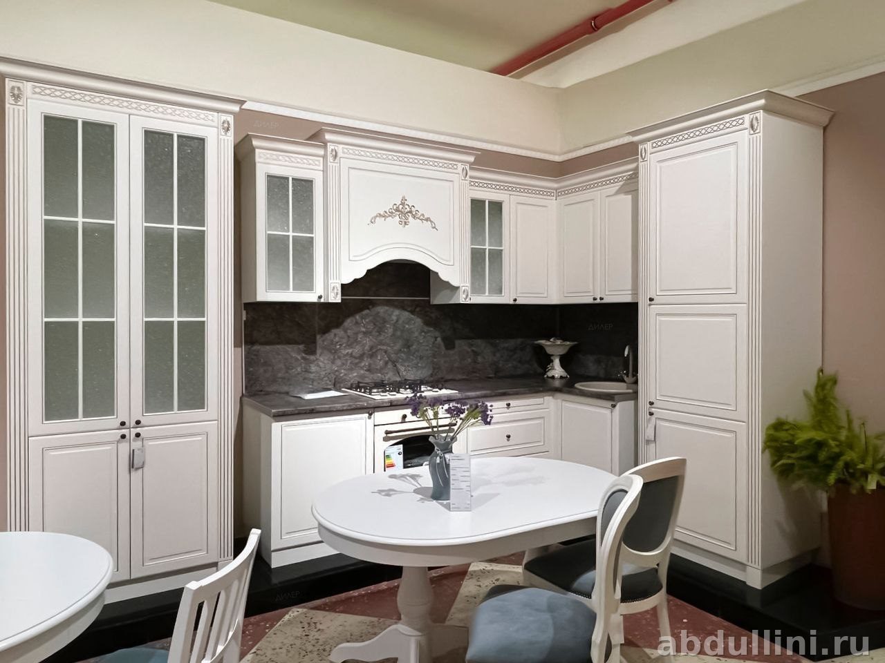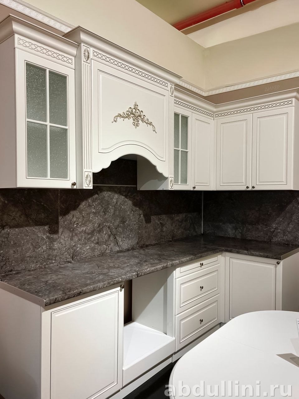 - В комплект входят: высокий шкаф-пенал с застекленными и глухими секциями, навесные шкафы с декоративной вытяжкой и узором, напольные шкафы под мойку, плиту и выдвижные ящики.
