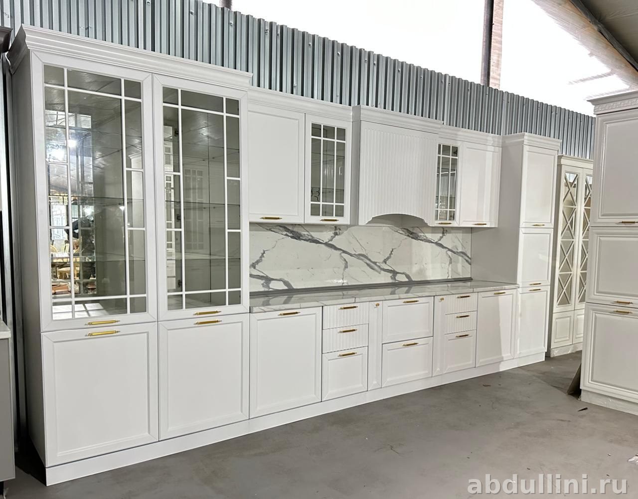 Кухонный гарнитур 1407 «Женева» выполнен в классическом стиле с элементами неоклассики. Белый матовый цвет фасадов и золотистая фурнитура создают сдержанный и стильный образ. Гарнитур идеально подходит для тех, кто ценит функциональность и эстетику.