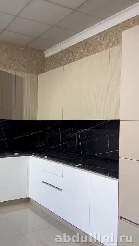 - Столешница и стеновые панели: черные с мраморным рисунком, глянцевые.