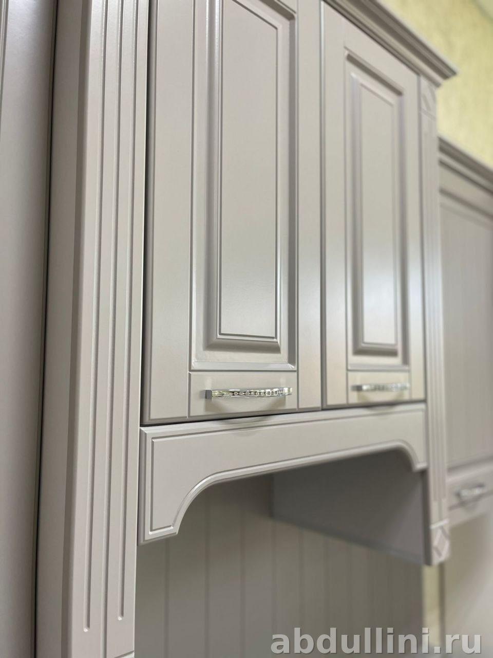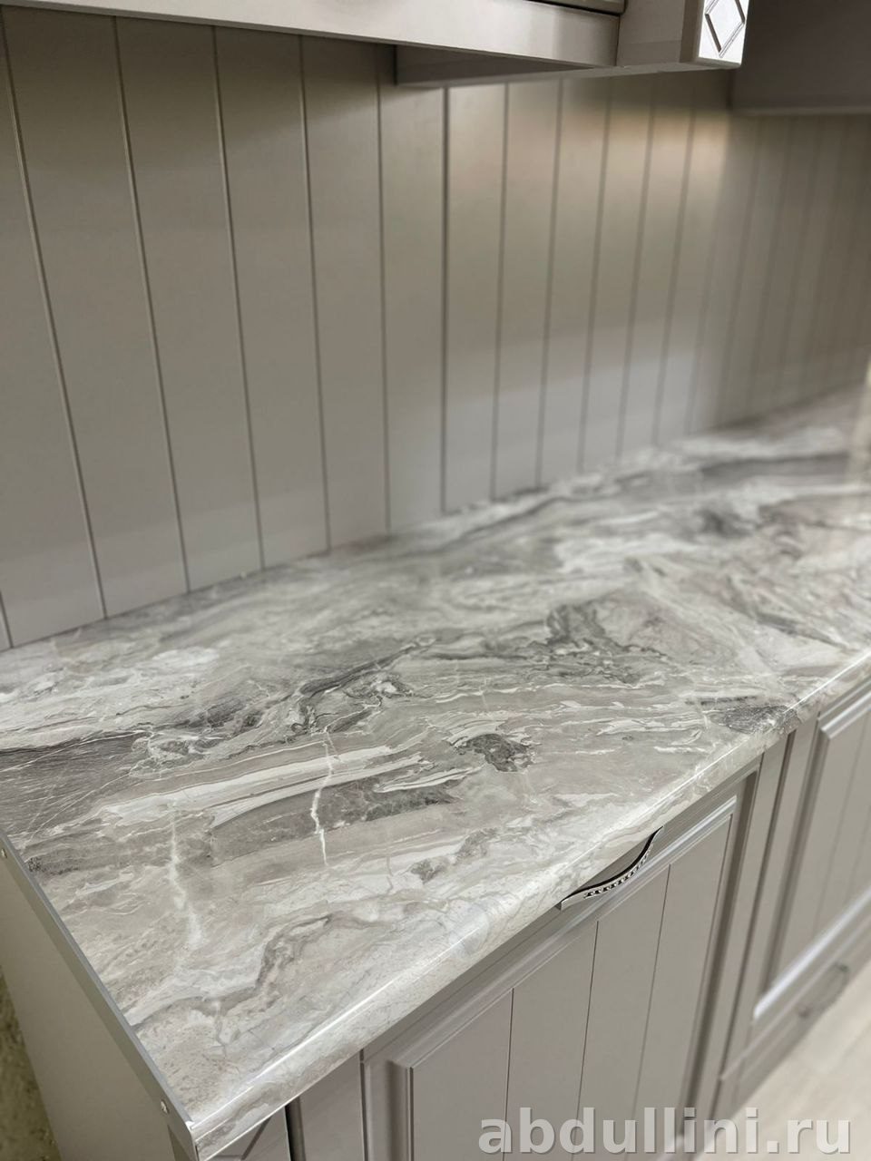 Цвет гарнитура — светло-серый с бежевым подтоном, матовая поверхность. Фасады украшены вертикальными филенками и молдингами, ручки — серебристые с кристаллами. Столешница имитирует мрамор с серыми прожилками.