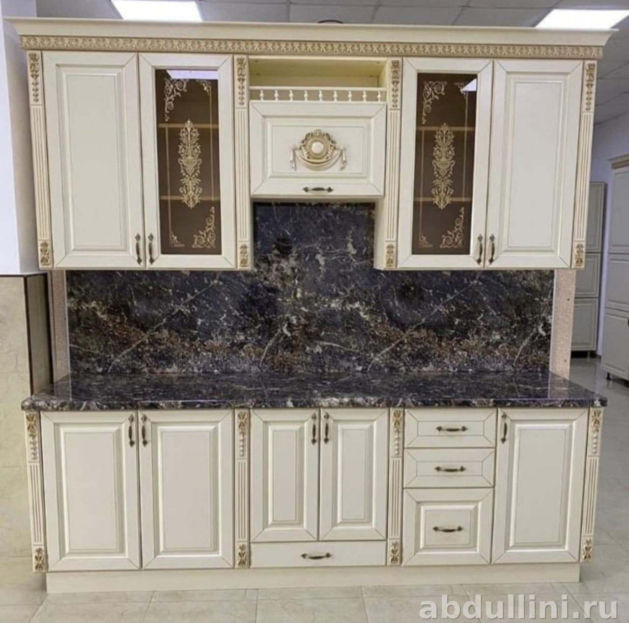 Материалы: фасады — МДФ с эмалью (цвет «слоновая кость» с теплым подтоном), корпуса — ЛДСП. Матовая отделка, молдинги по периметру, золотая патина на выступающих деталях.